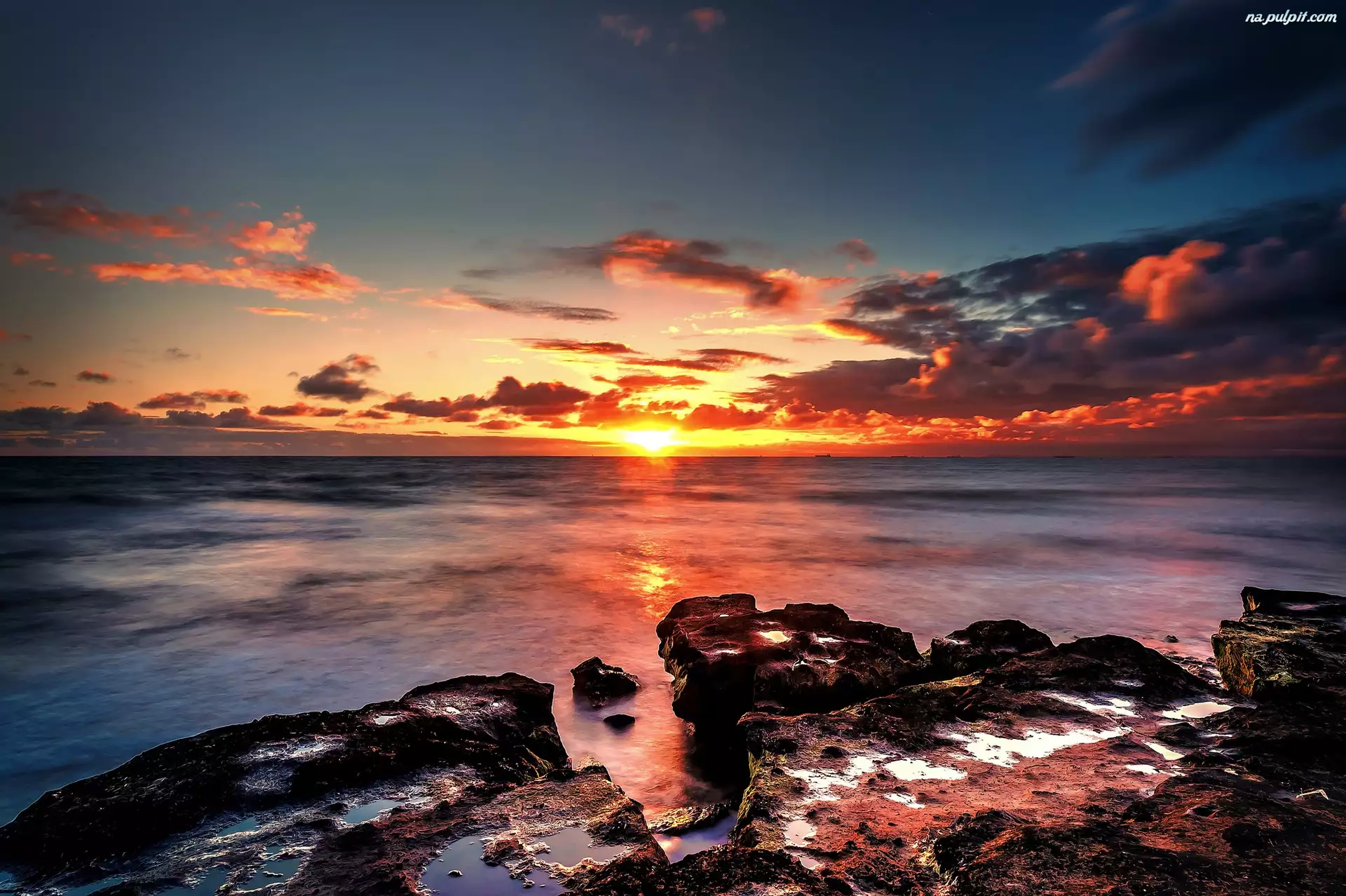 Słońca, Morze, Chmury, Kamienie, Zachód