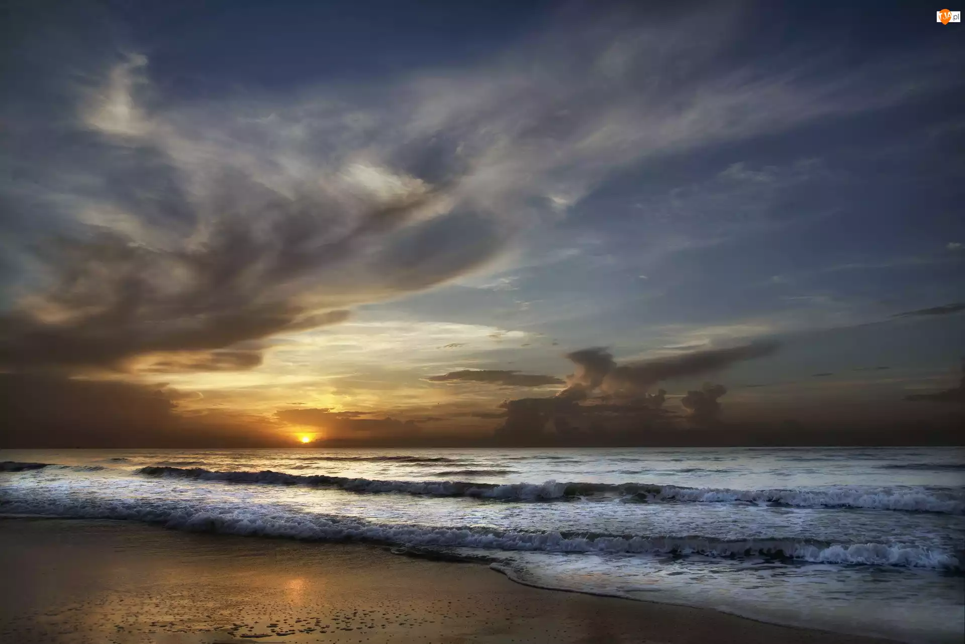 Morze, Slonca, Chmury, Niebo, Zachod