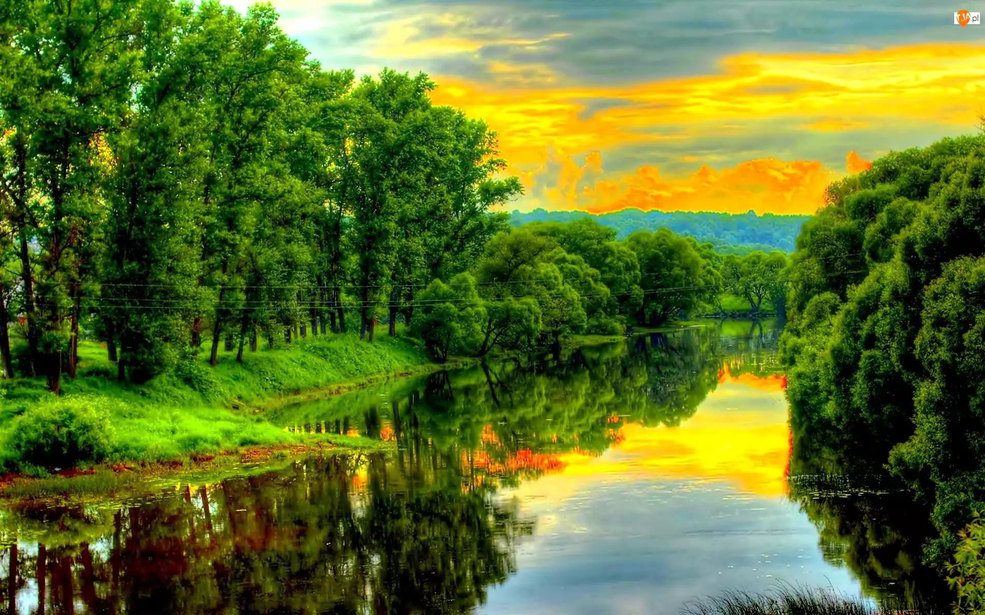 Słońca, Niebo, Trawa, Rzeka, Odbicie, Las, Zach�