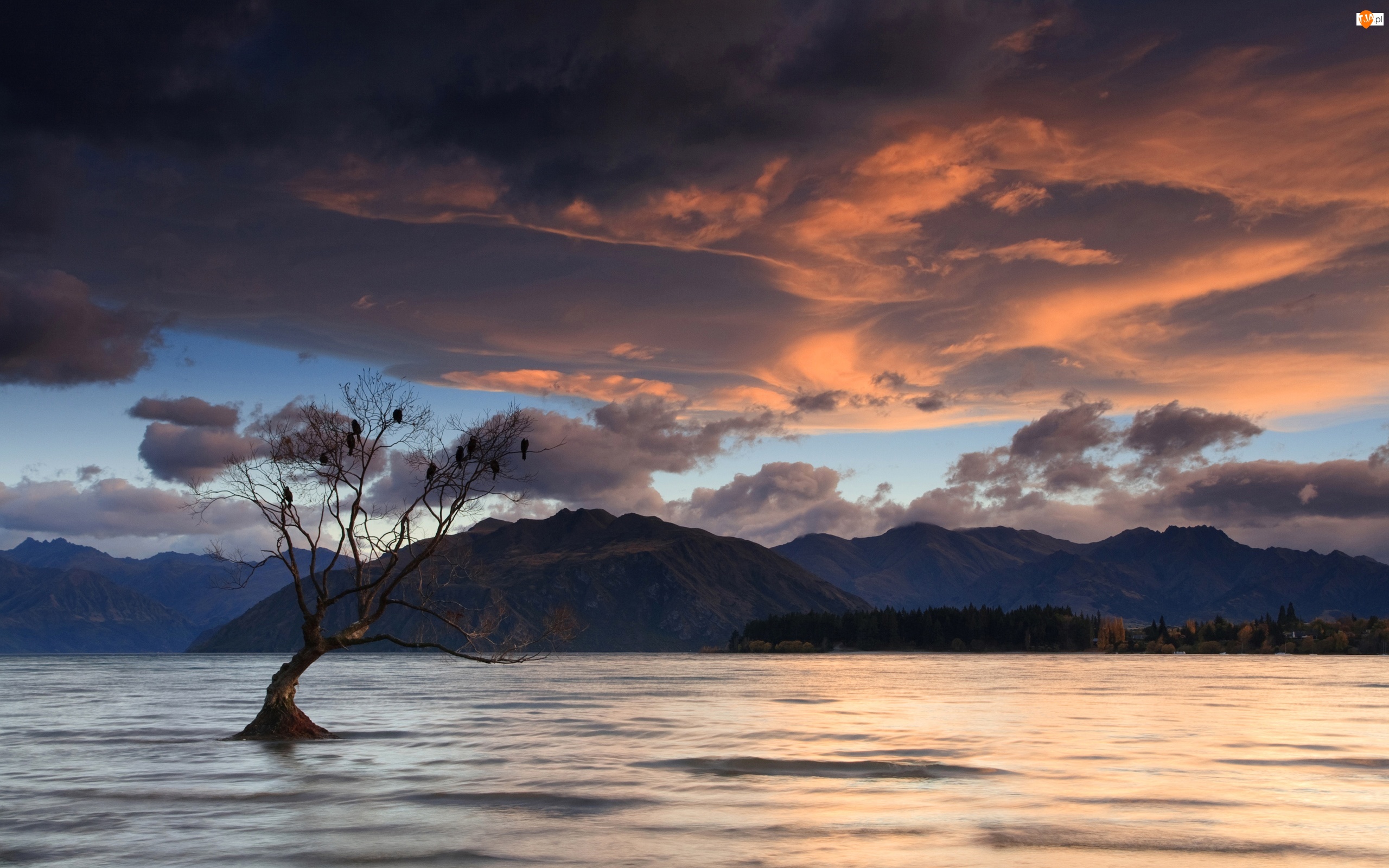 Słońca, Ptaki, Samotne, Woda, Wzgórza, Drzewo, Zachód