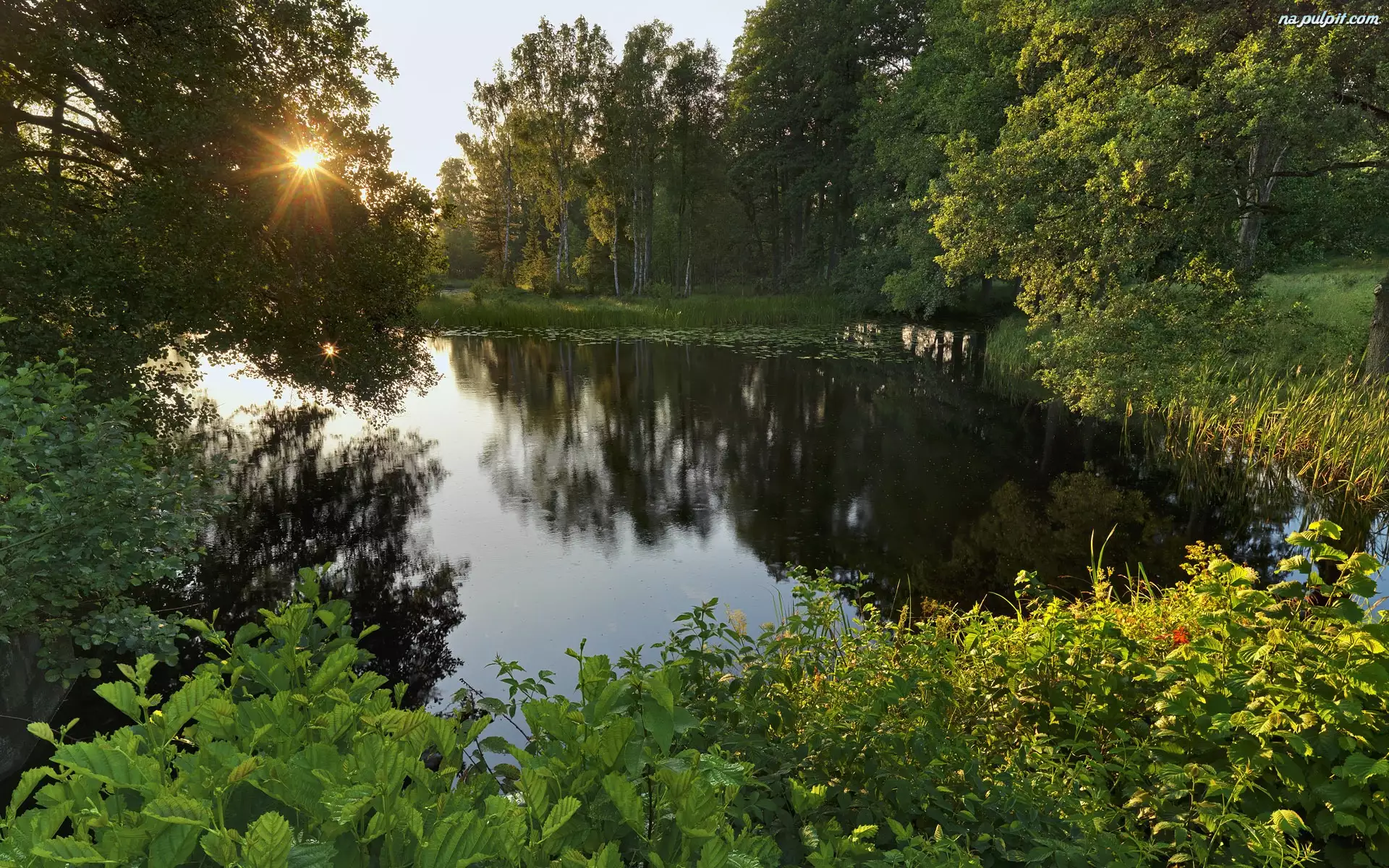 Słońca, Rzeka, Krzewy, Las, Promienie
