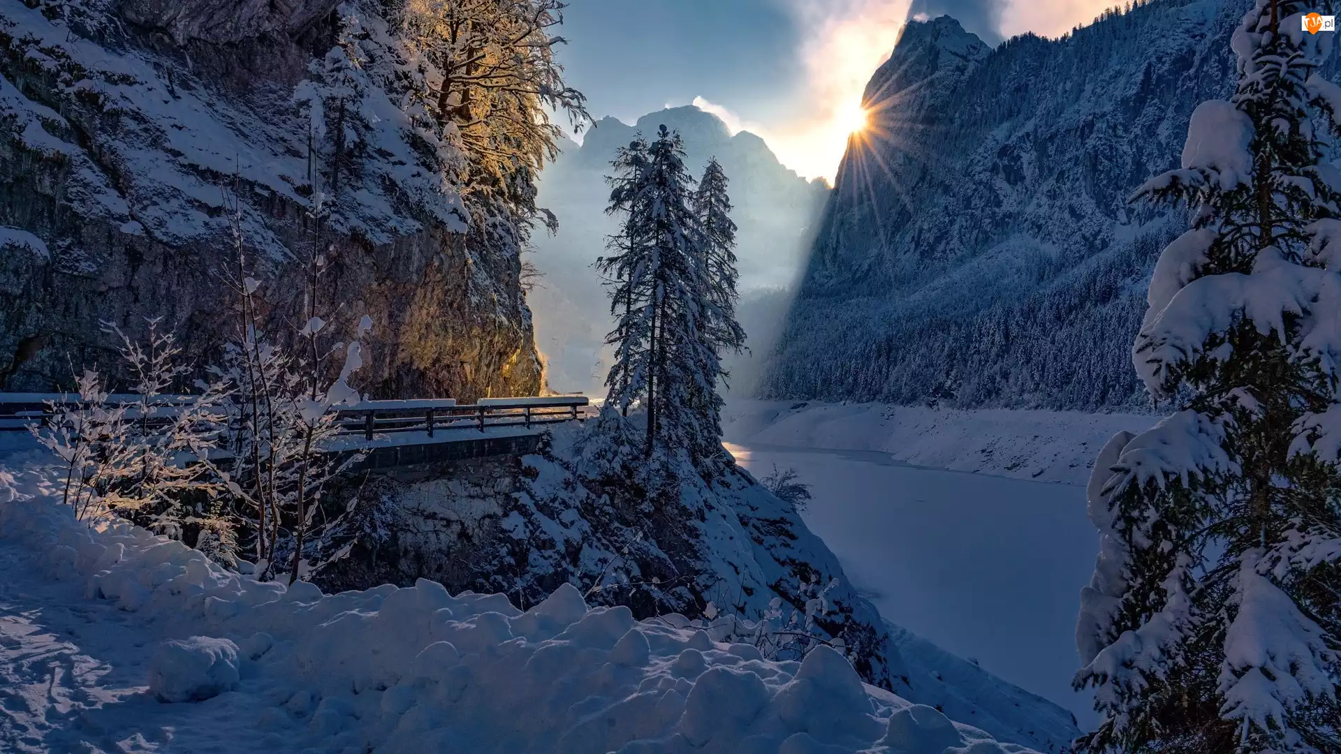 Słońce, Jezioro, Gosausee, Most, Zima, Austria, Ośnieżone, Góry, Drzewa, Śnieg