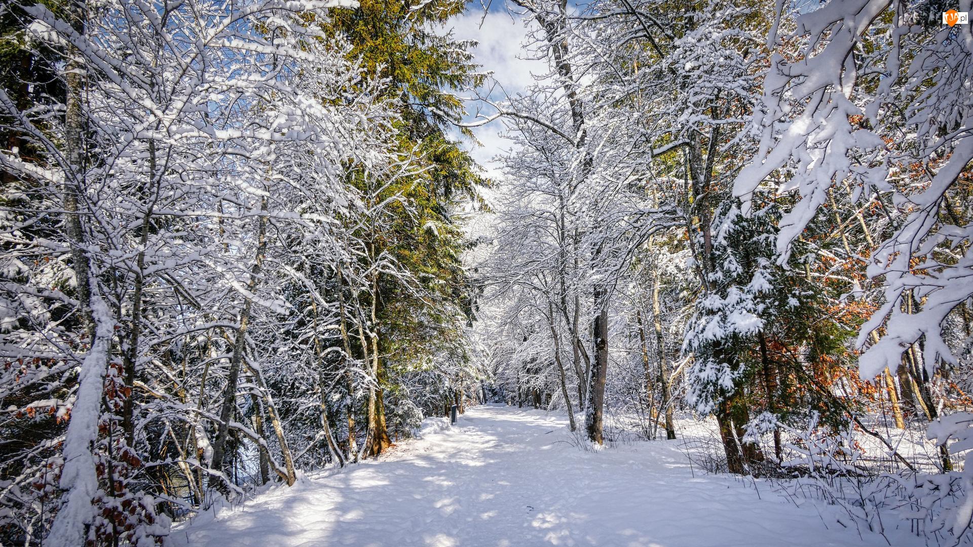 Drzewa, Las, Dzień, Zima, Słoneczny, Śnieg, Droga