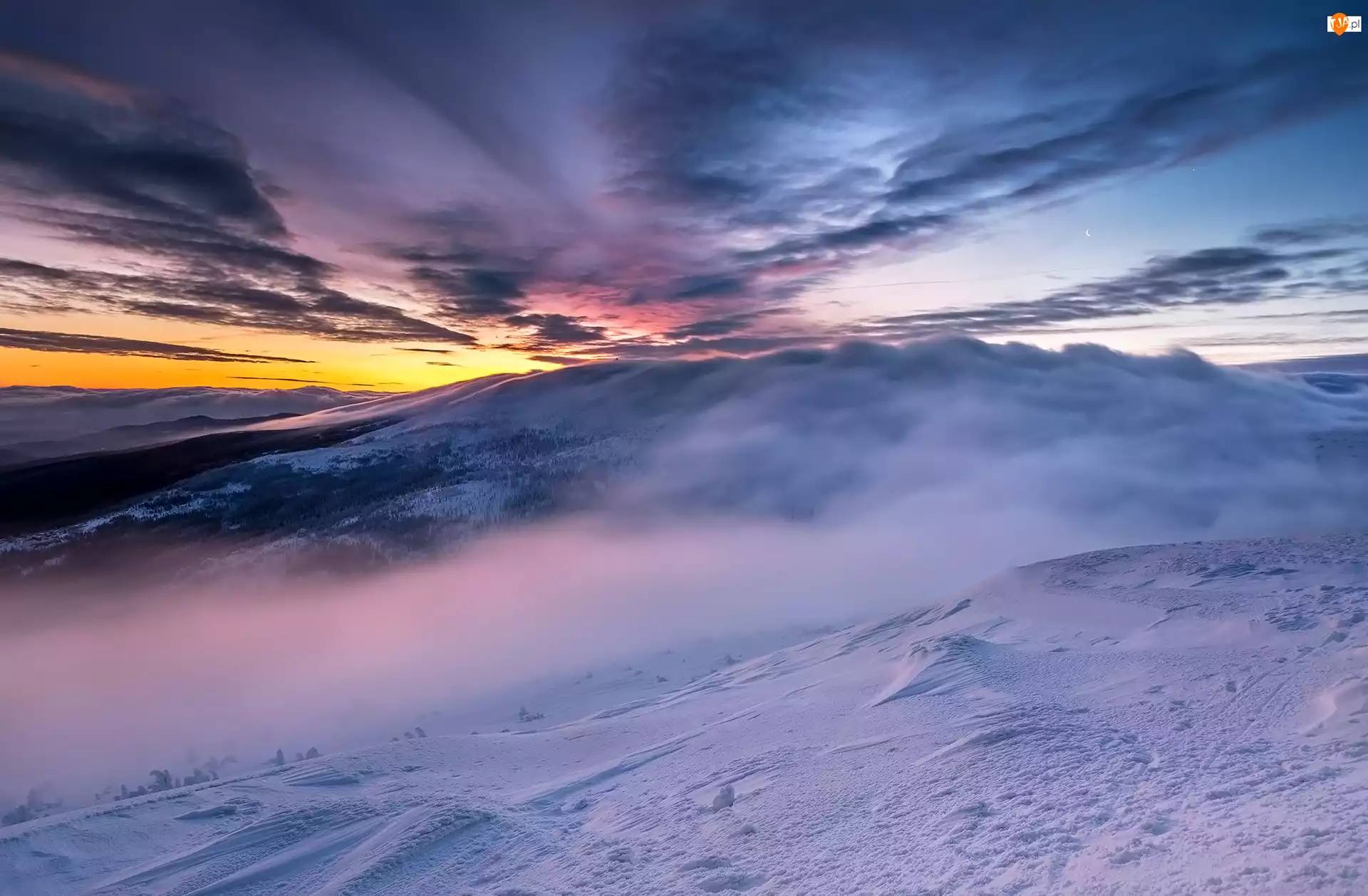 Chmury, Zima, Góry, Zachód słońca