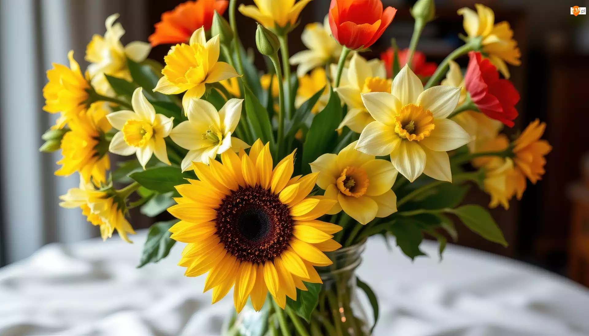 Słonecznik ozdobny, Narcyzy żonkile, Stół, Kwiaty, Wazon, Bukiet, Maki