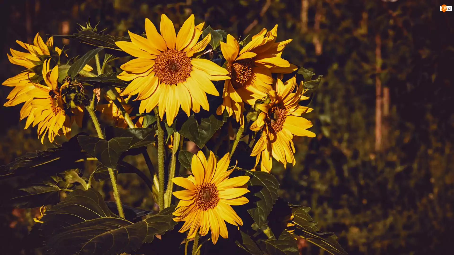 Słońca, Rozmycie, Blask, Słoneczniki, Drzewa