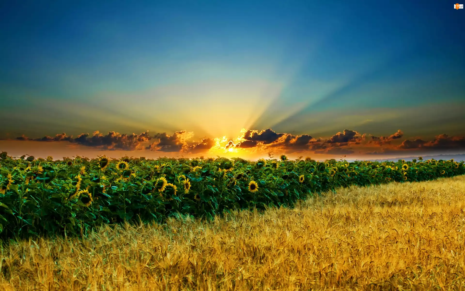 Słoneczniki, Zachód słońca, Zboże, Lato