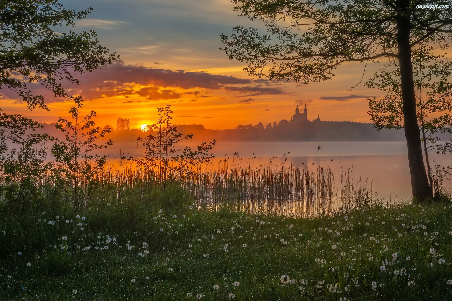 Drzewa, Jezioro, Wschód słońca, Mgła