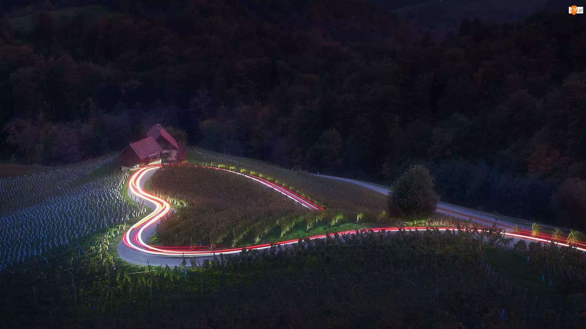 Słowenia, Dom, Wieś Spicnik, Serce, Plantacja, Drzewa, Oświetlona, Winnica, Droga, Gmina Kungota