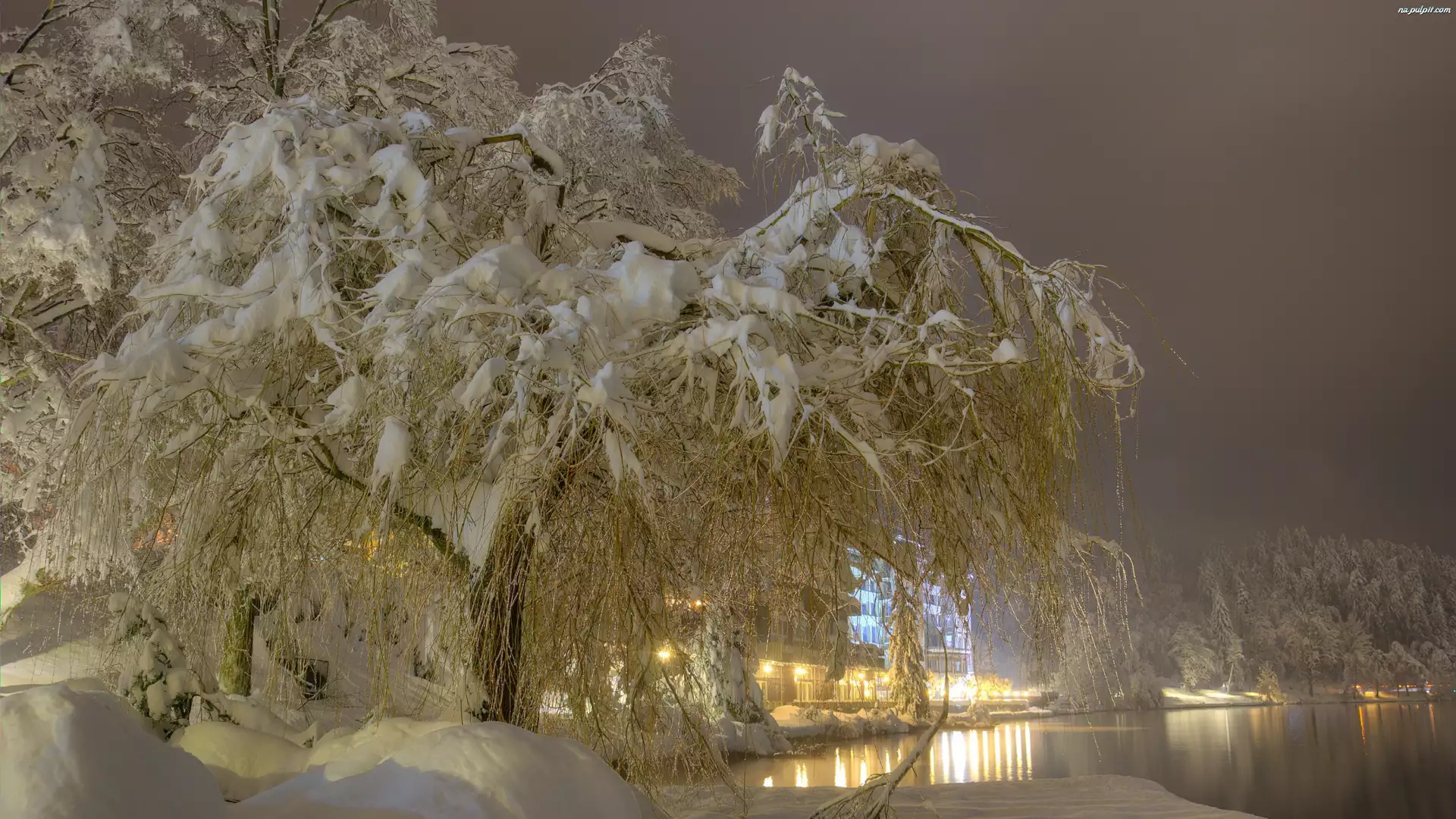 Słowenia, Zima, Las, Jezioro, Drzewa