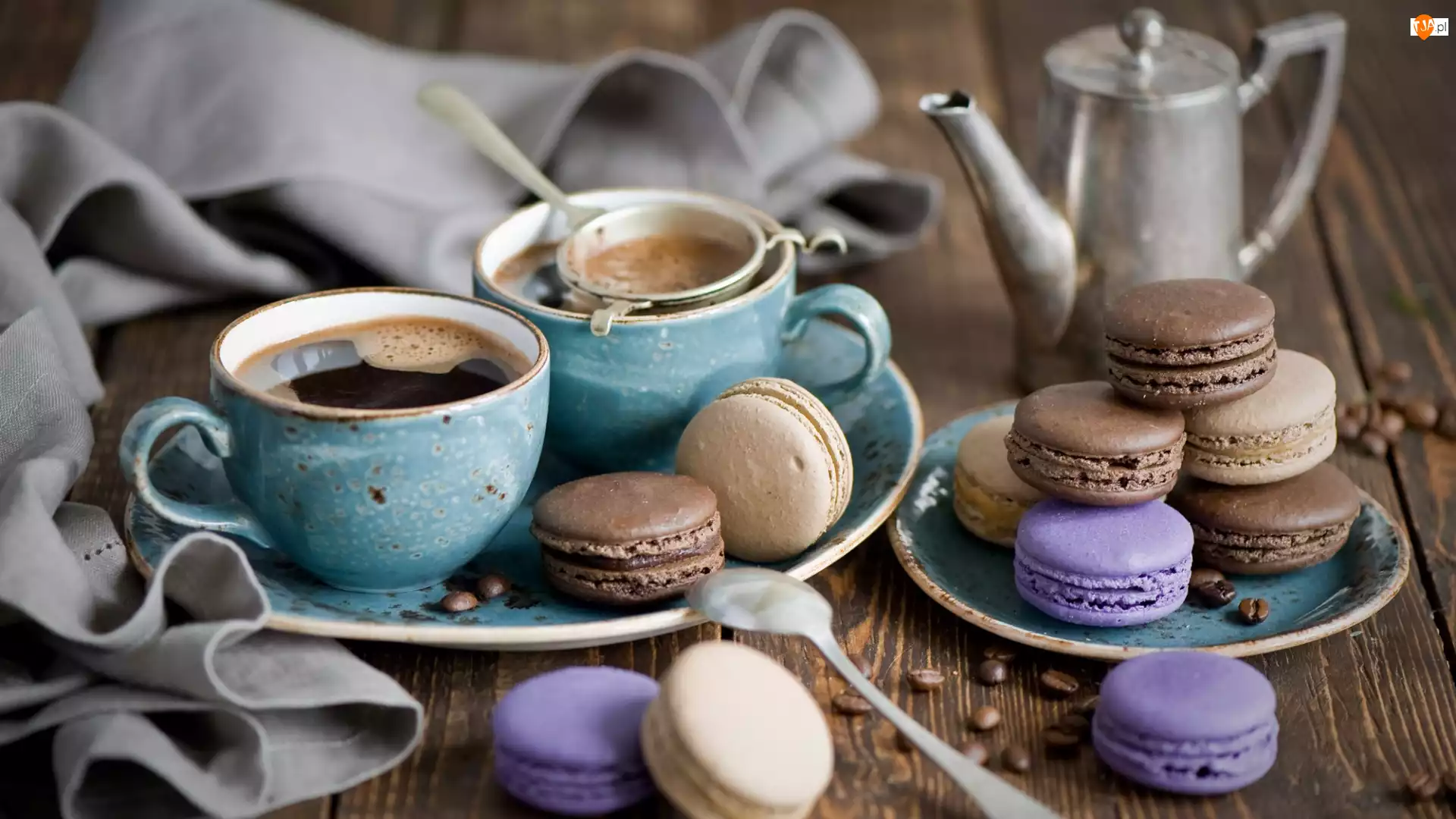 Ziarna, Kompozycja, Ciastka, Dzbanek, Kawa, Makaroniki, Łyżeczka, Filiżanki