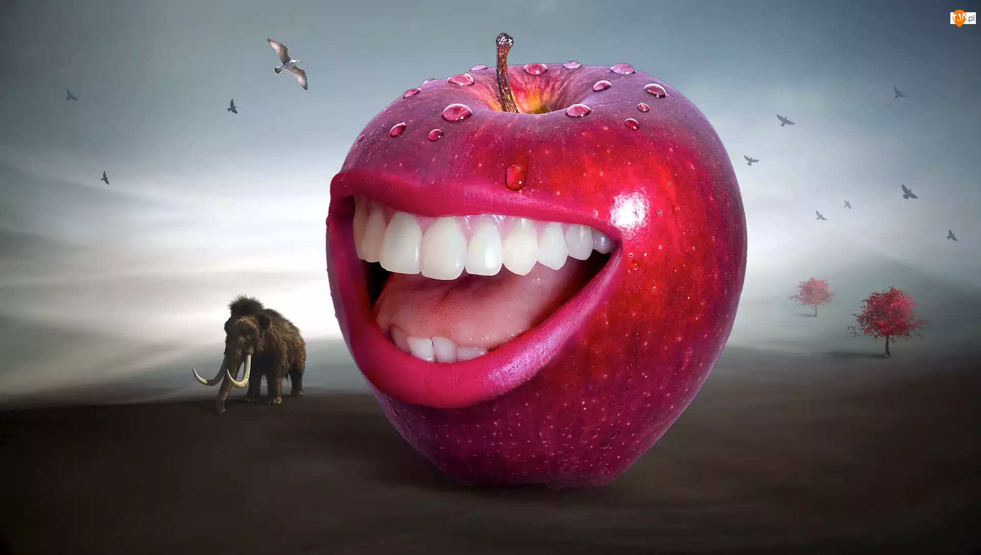Mamut, Uśmiech, Grafika 2D, Czerwone, Zęby, Jabłko, Ptaki, Usta, Drzewo