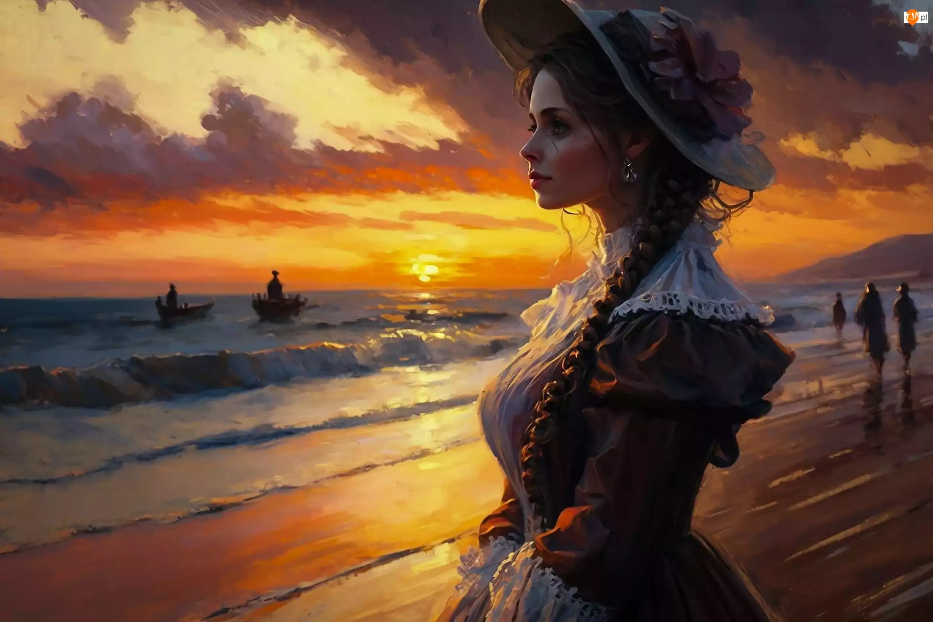 Kobieta, Morze, Warkocz, Malarstwo, Kapelusz, Smutna