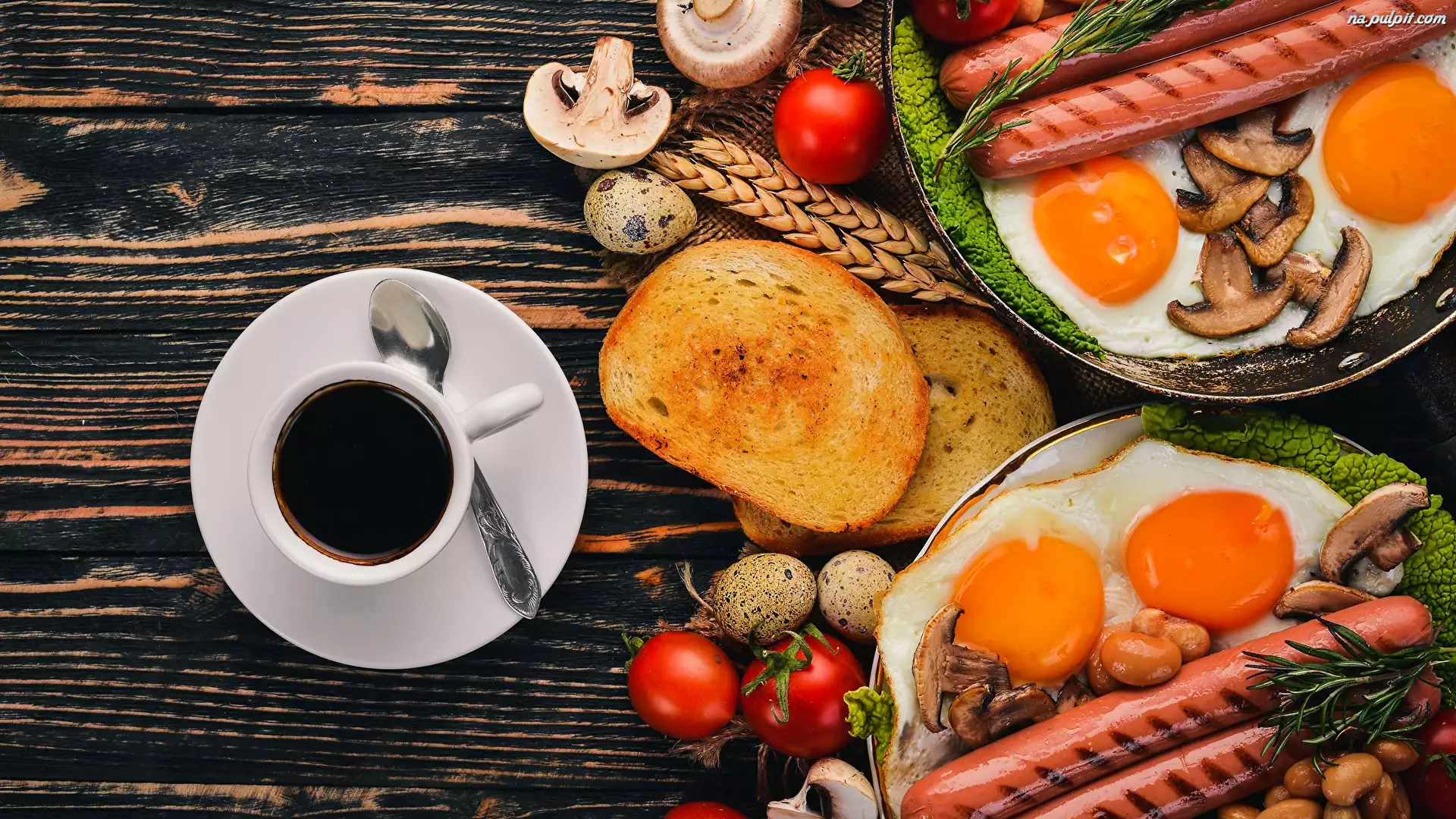Kawa, Jajka, Grzanki, Śniadanie, Pomidory, Pieczarki, Parówki