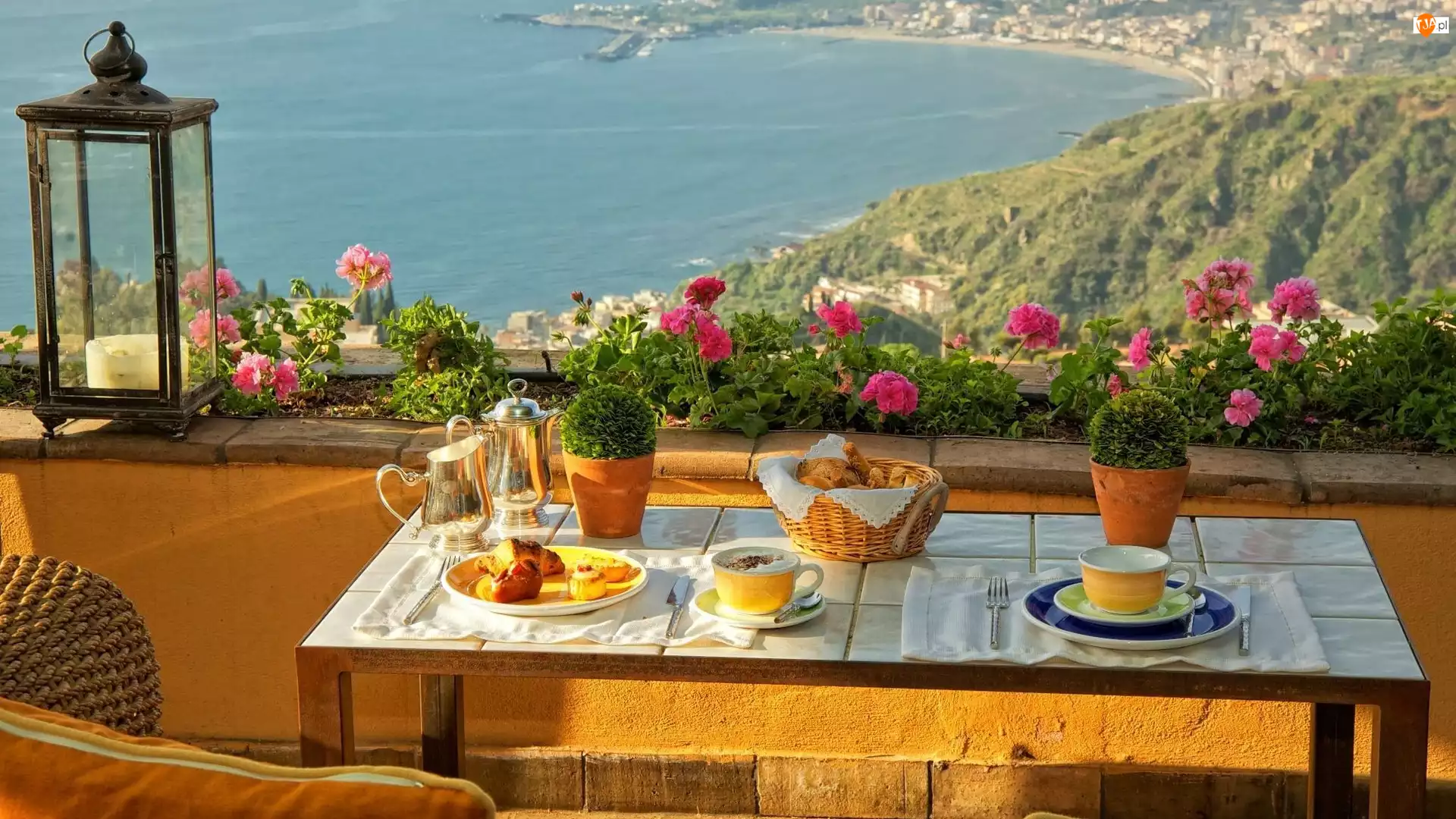 Widok, Taras, Lampion, Pelargonie, Śniadanie, Kwiaty