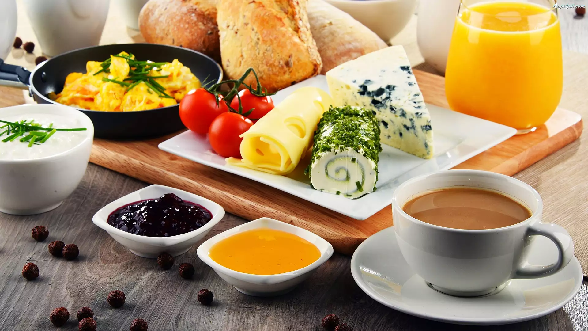 Pieczywo, Szklanka, Dżem, Twarożek, Pomidory, Filiżanka, Sok, Śniadanie, Deska, Sery, Kawa