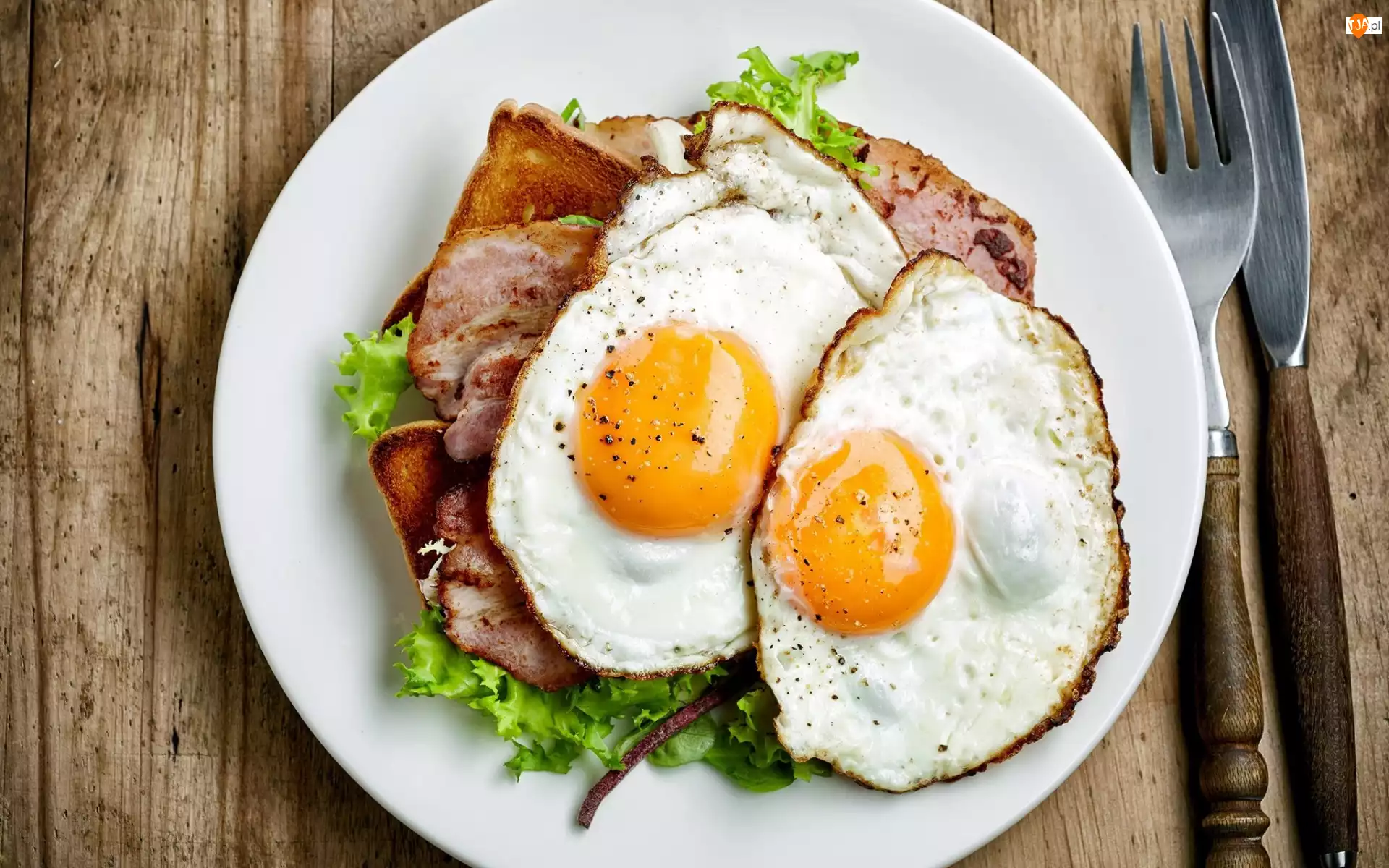 Tosty, Śniadanie, Boczek, Talerz, Jajka sadzone, Sztućce