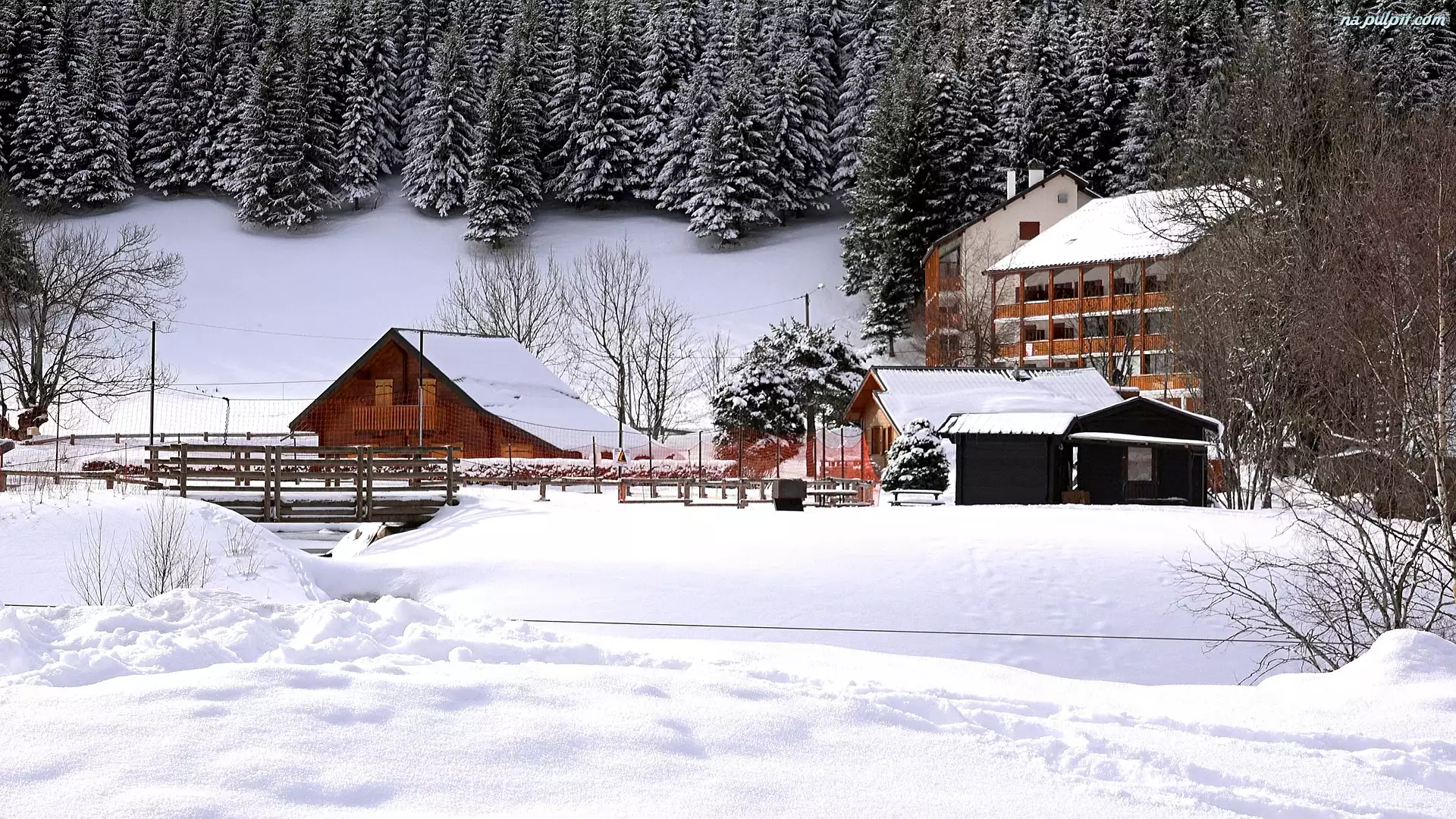 Zima, Drzewa, Śnieg, Domy, Las