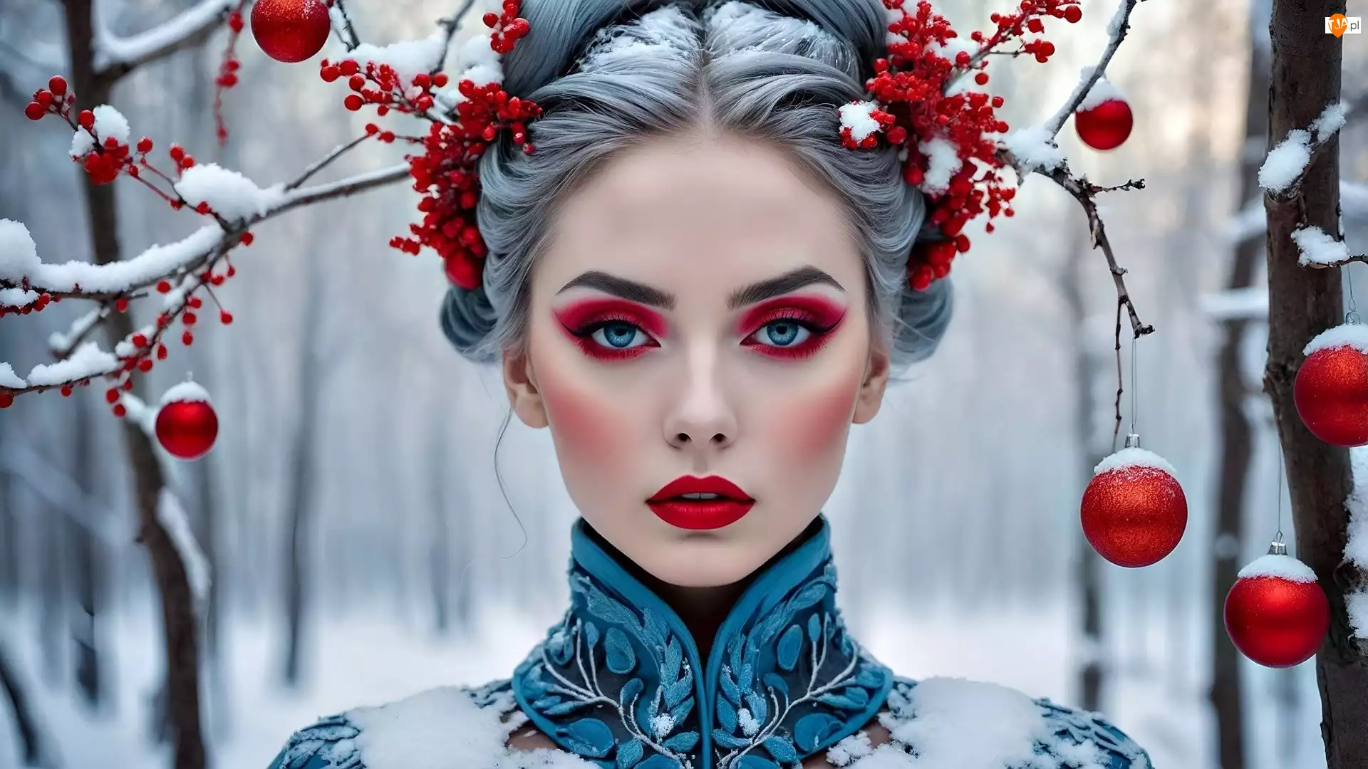 Śnieg, Bombki, Makijaż, Kobieta, Gałęzie