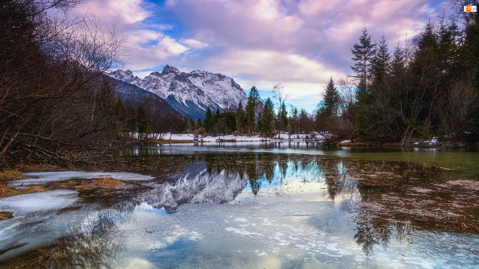 Śnieg, Chmury, Jezioro, Góry, Drzewa