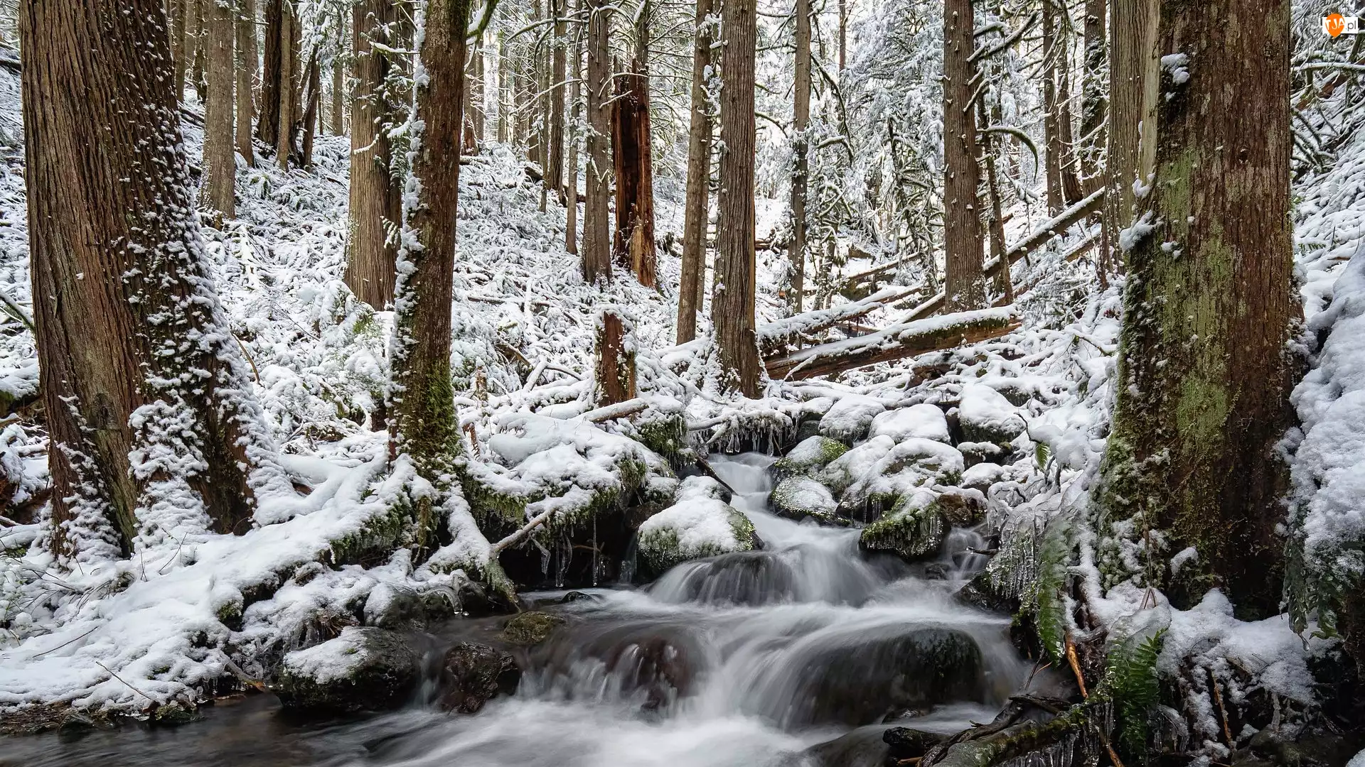 Śnieg, Drzewa, Las, Zima, Strumyk