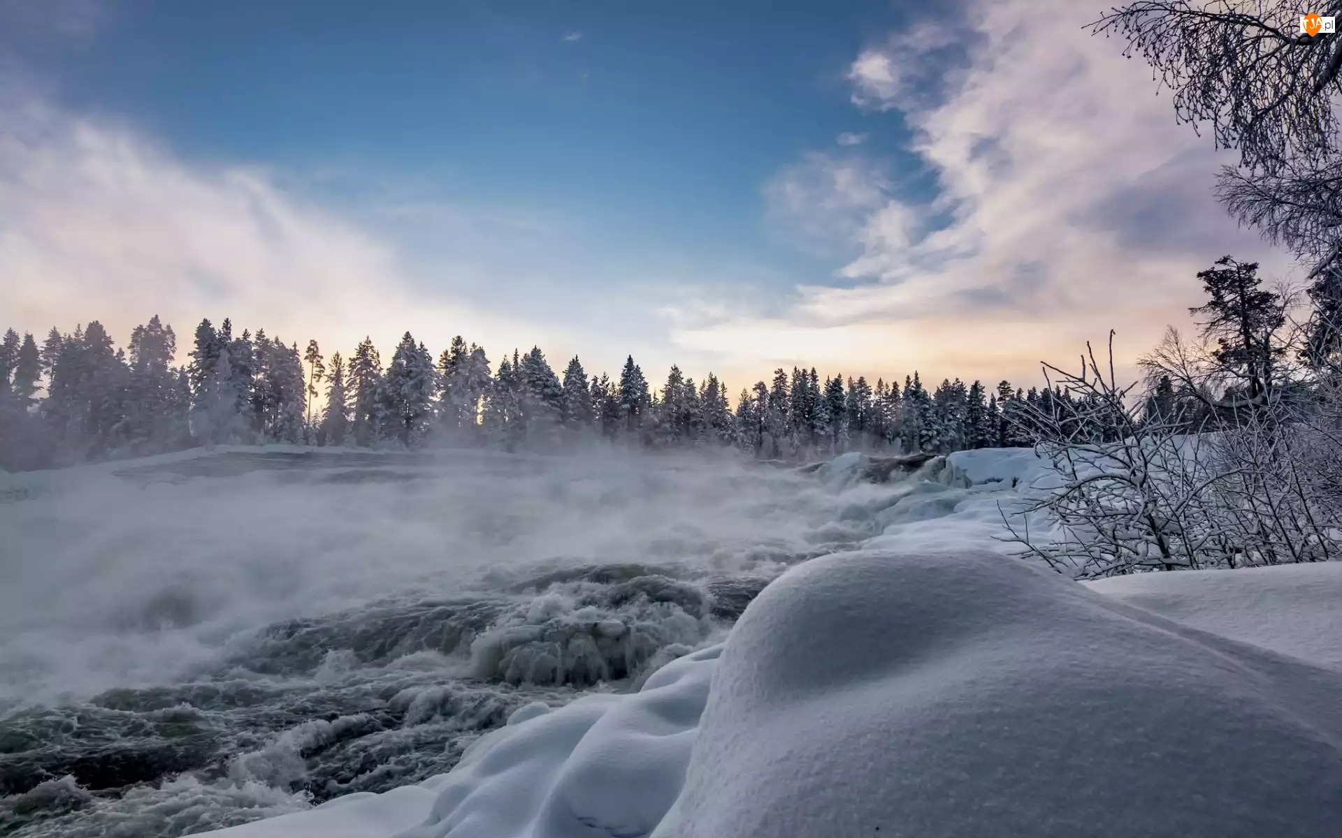 Śnieg, Drzewa, Poranek, Zima, Zaspy, Potok, Rzeka