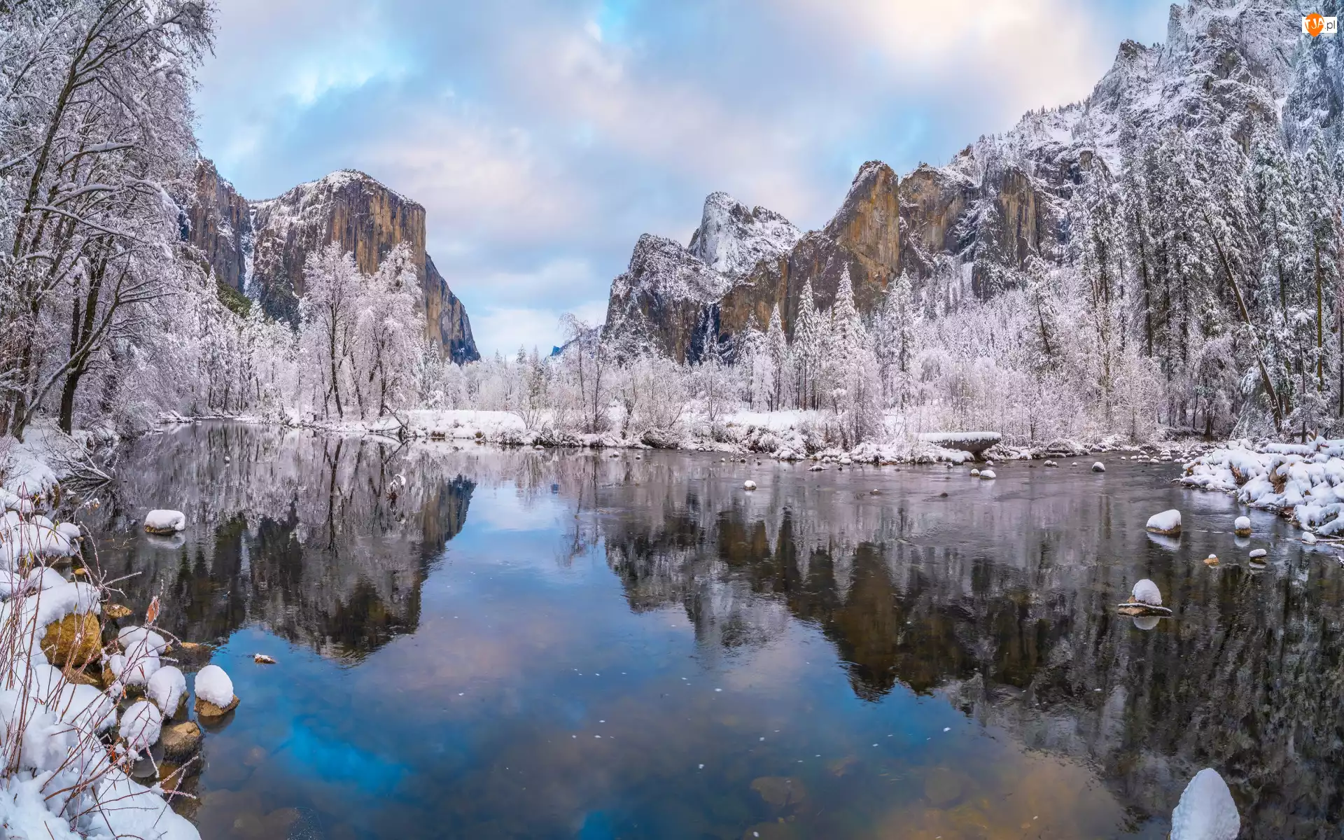 Śnieg, Góry, Chmury, Stany Zjednoczone, Park Narodowy Yosemite, Zima, Rzeka, Kamienie, Drzewa, Merced River, Odbicie, Kalifornia