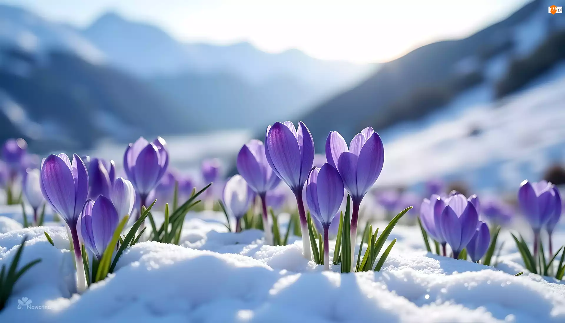 Śnieg, Grafika, Krokusy, Fioletowe, Góry