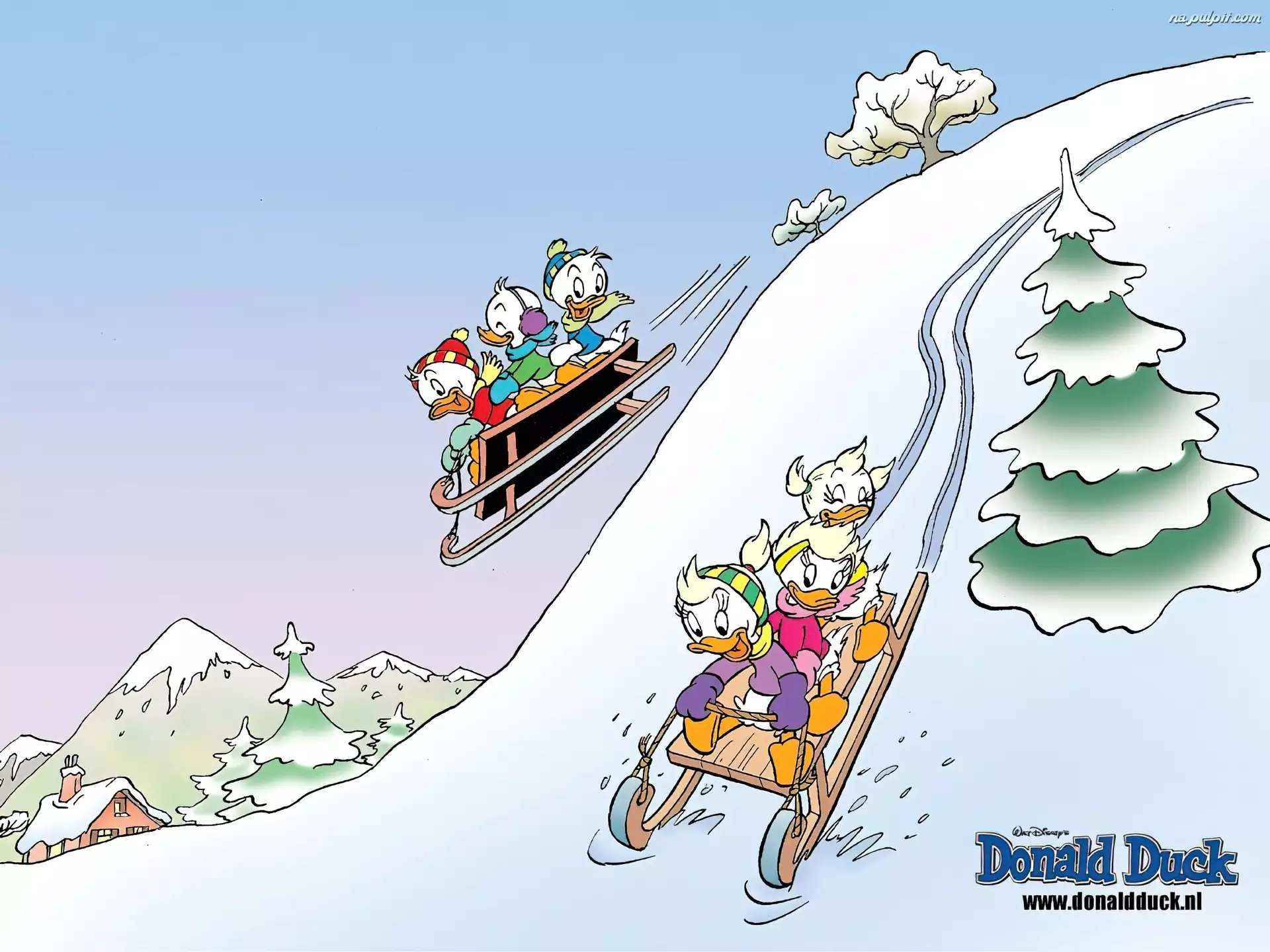 śnieg, Kaczor Donald, sanki