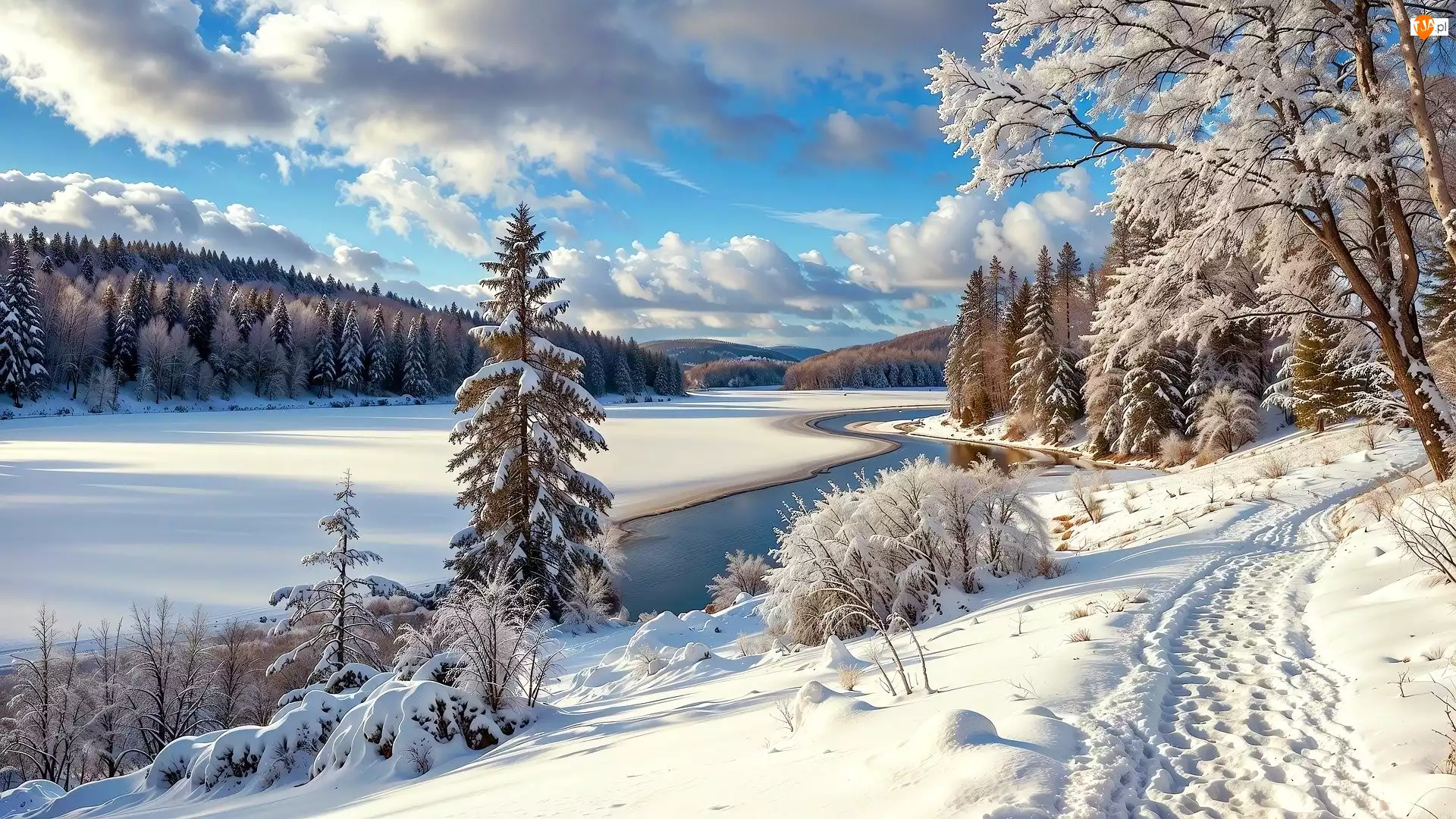 Śnieg, Rzeka, Ślady, Zima, Droga, Drzewa, Ośnieżone