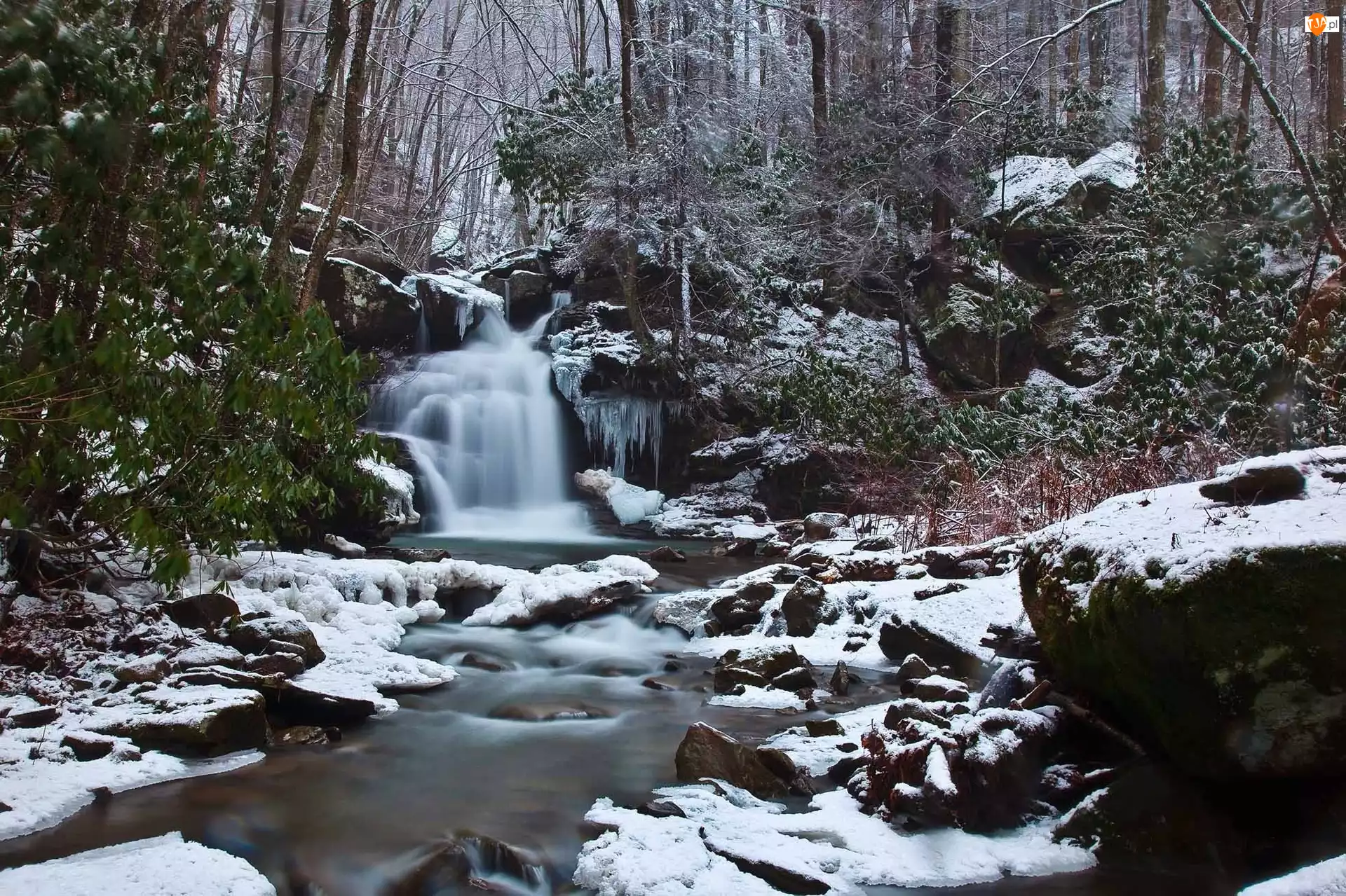 Śnieg, Wodospad, Las