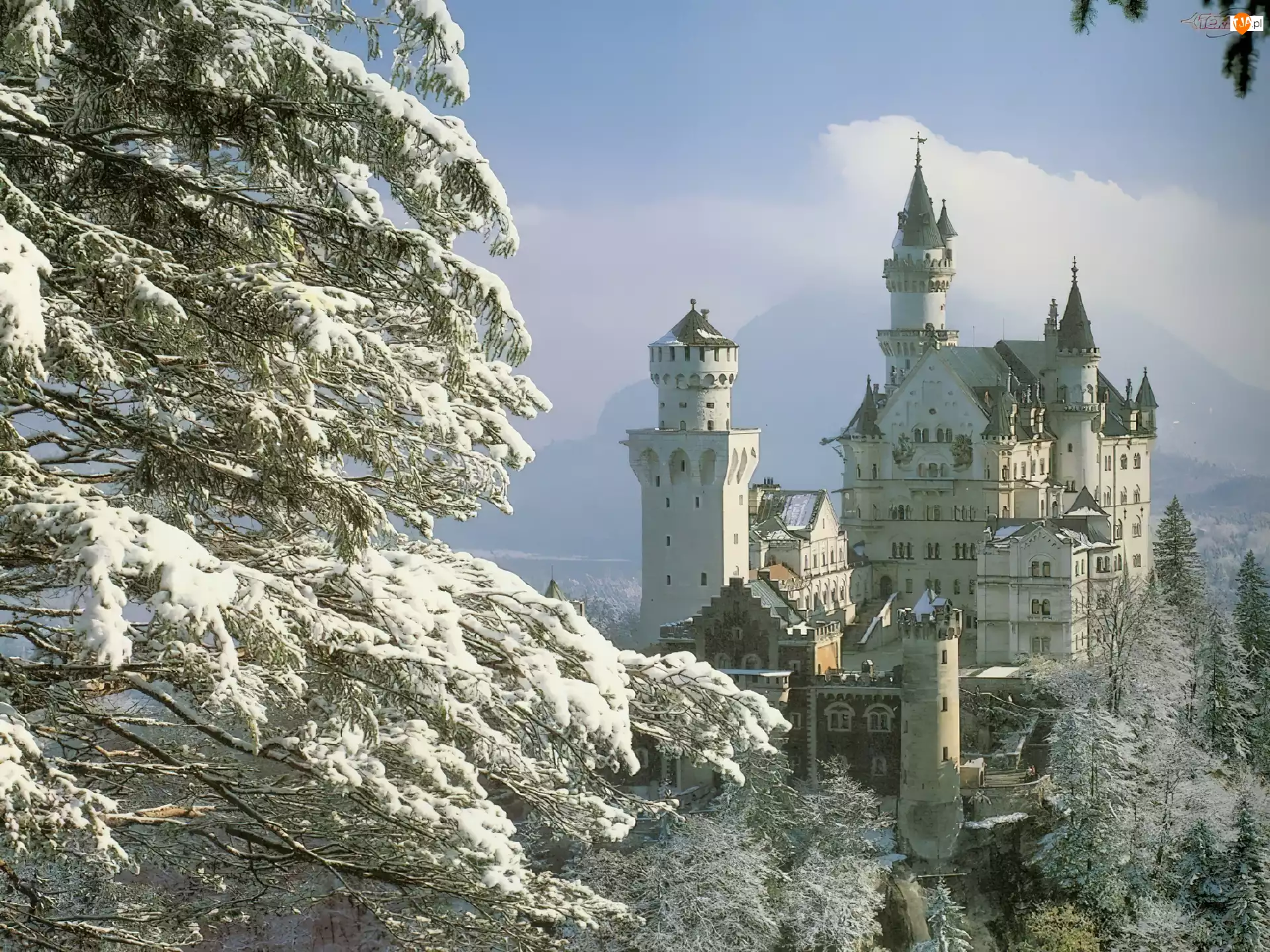 Bawaria, Niemcy, Lasy, Zima, Zamek Neuschwanstein, Drzewa