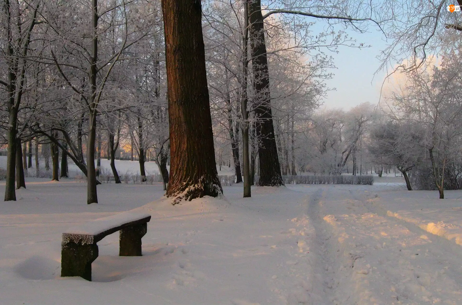 Śnieg, Zima, Drzewa, Park, Ławka