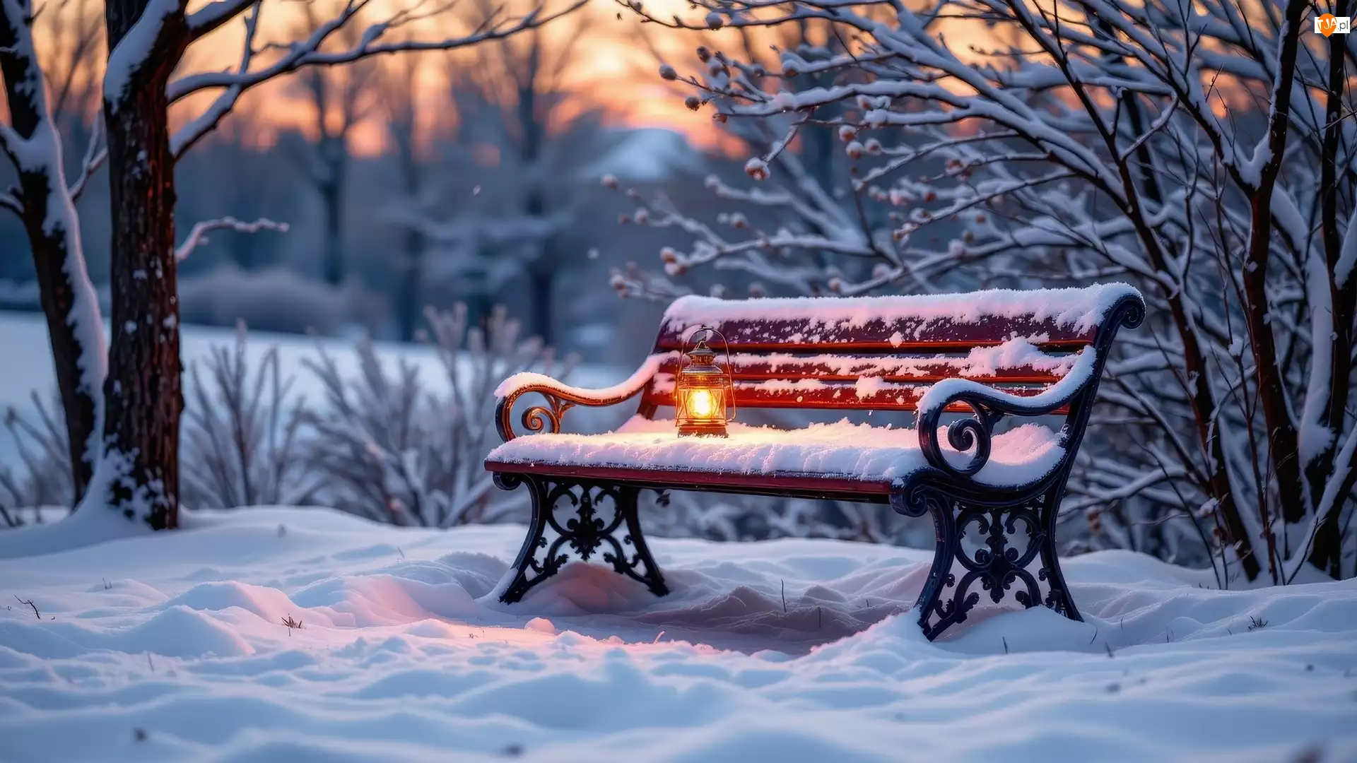 Śnieg, Zima, Ławka, Drzewa, Ośnieżona, Lampion