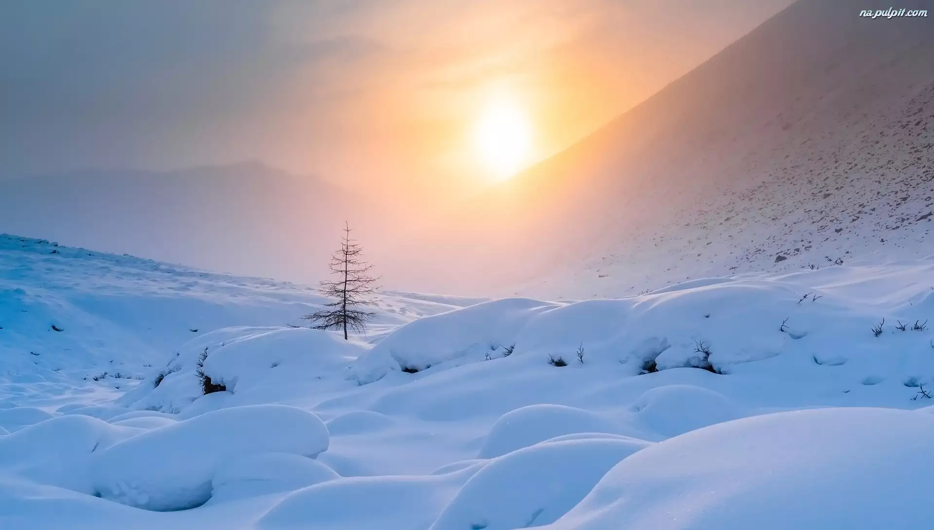 Śnieg, Zima, Mgła, Wschód słońca, Góry, Drzewo