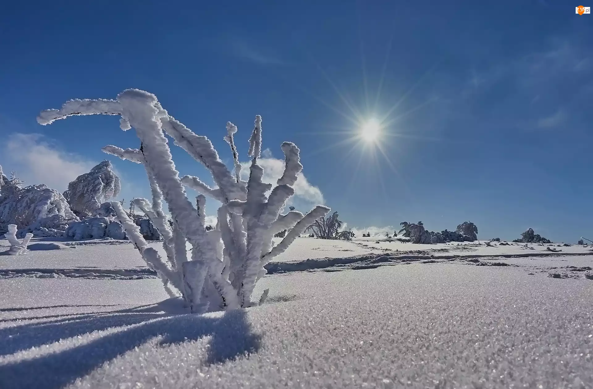 Śnieg, Zima, Ośnieżone, Promienie słońca, Drz