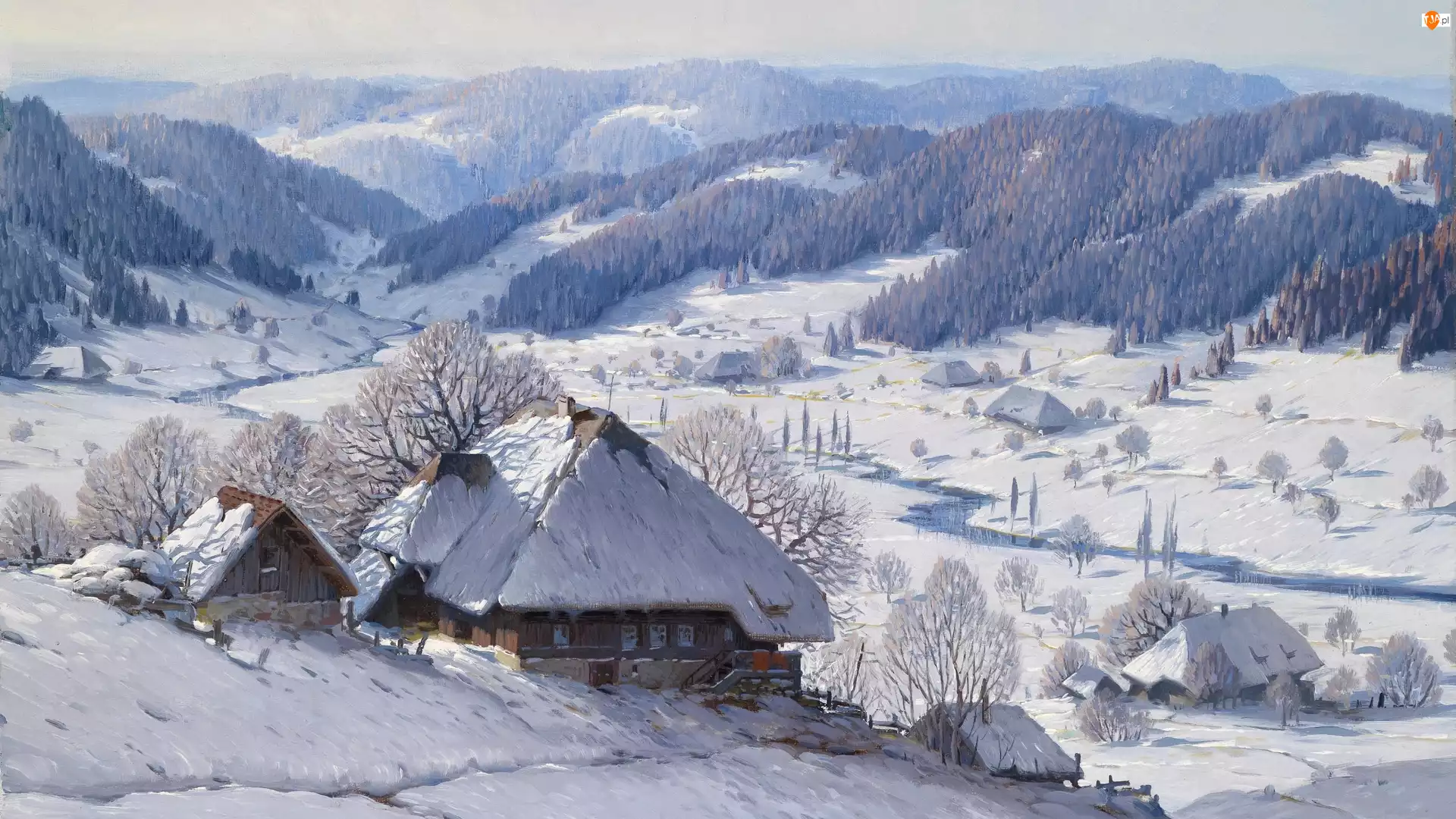 Malarstwo, Góry, Zima, Obraz, Domy, Pejzaż, Karl Hauptmann, Drzewa
