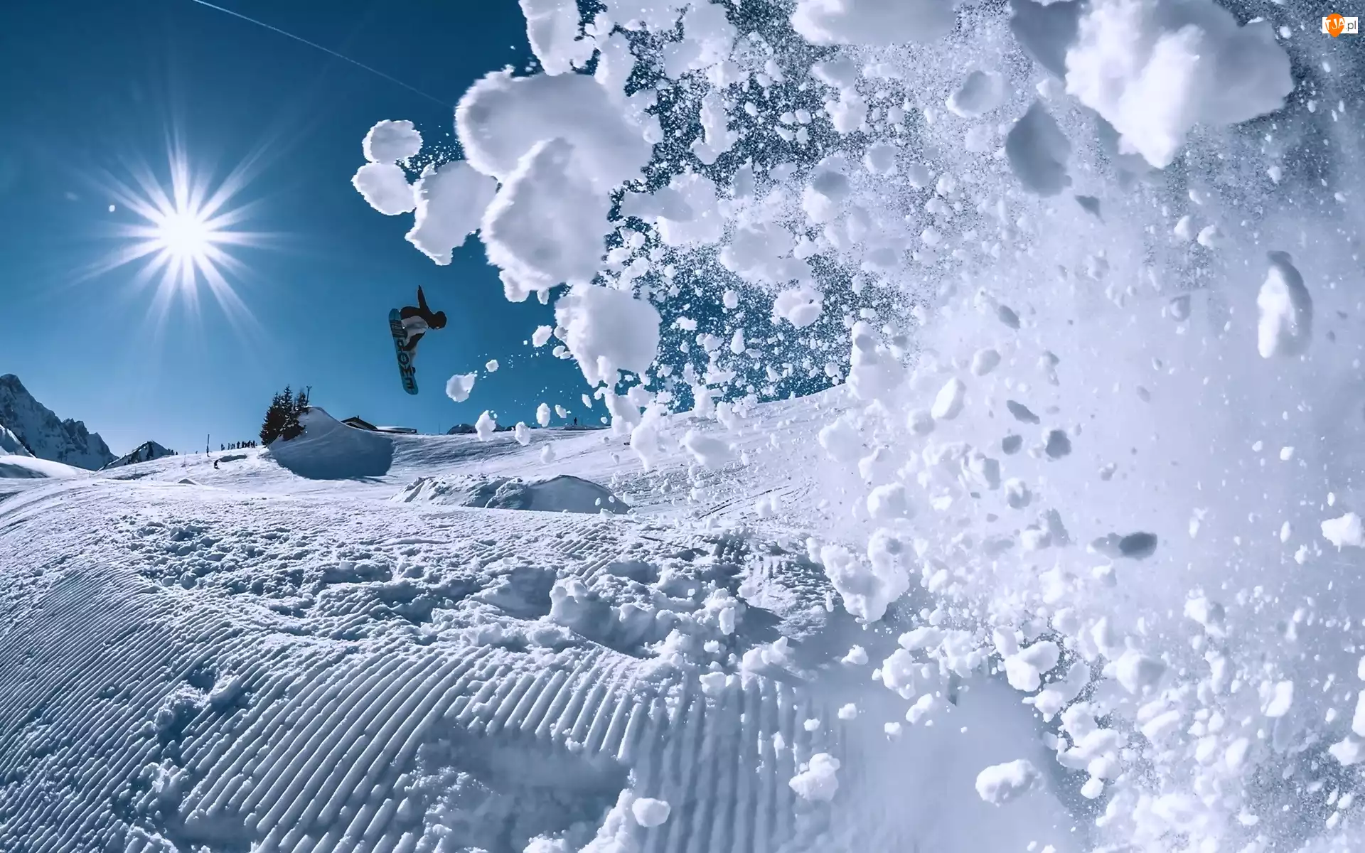 Snowbording, Zima, Promienie, Śnieg, Słońca