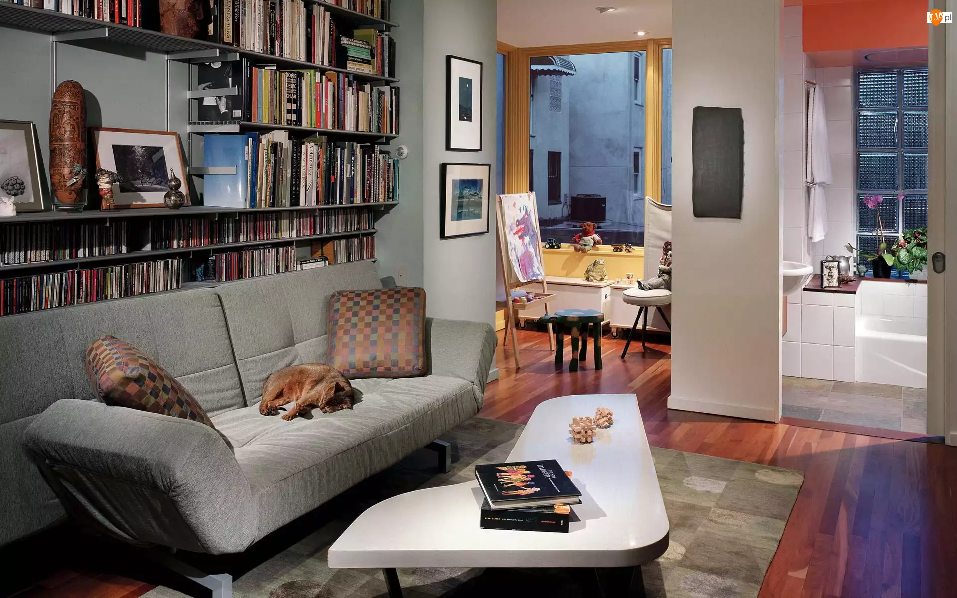 Sofa, Łazienka, Stolik, Książki