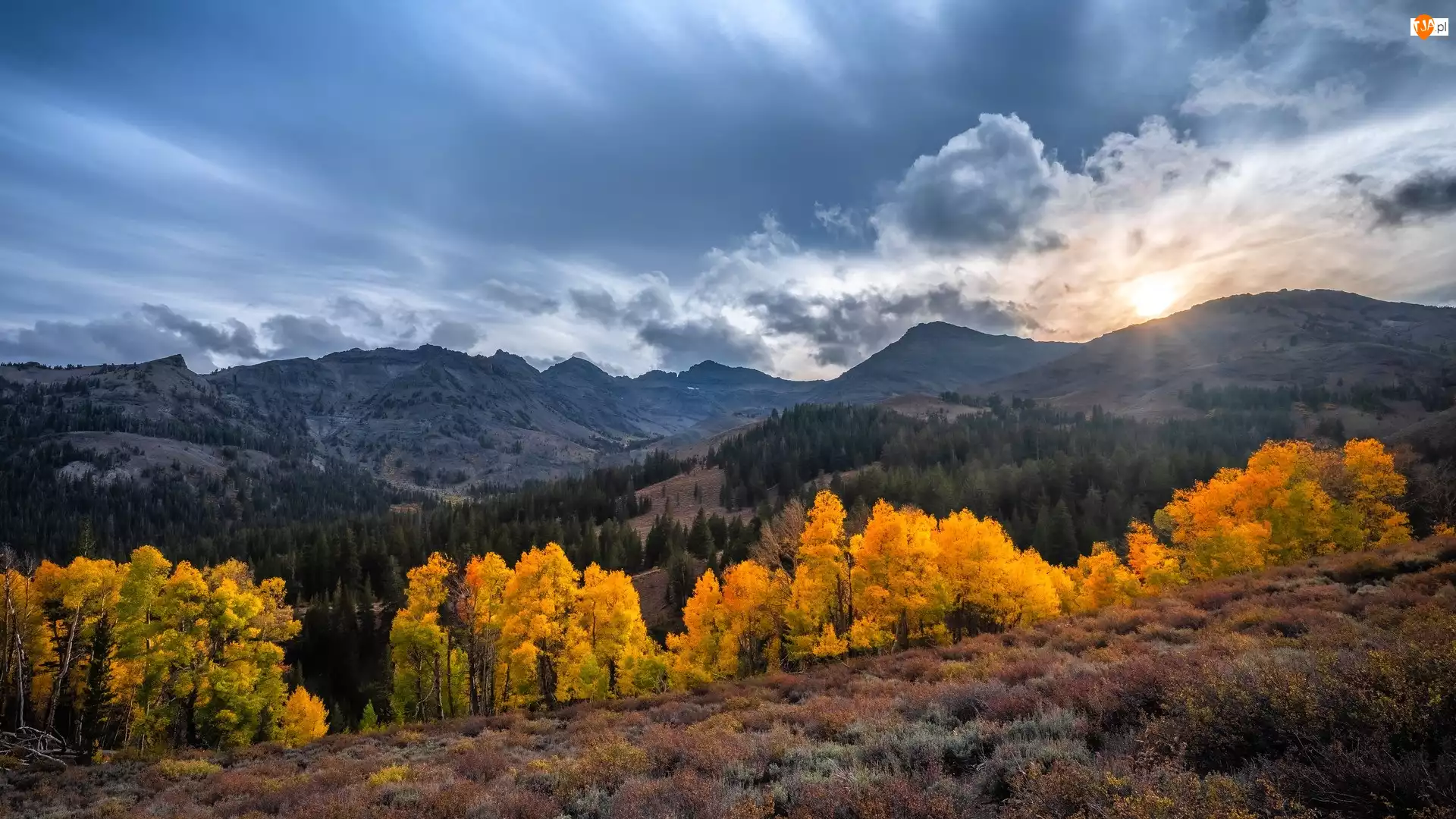 Sonora Pass, Góry, Eastern Sierra, Stany Zjednoczone, Kalifornia, Drzewa, Słońce, Jesień, Rośliny
