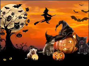 Halloweenowa noc z zwierzętami i dyniami oraz fruwającymi