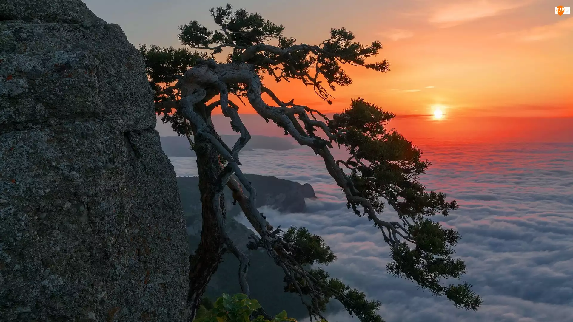 Morze, Miejscowość Ałuszta, Chmury, Drzewo, Sosna, Góra Demerdżi, Dolina Duchów, Krym, Wschód słońca