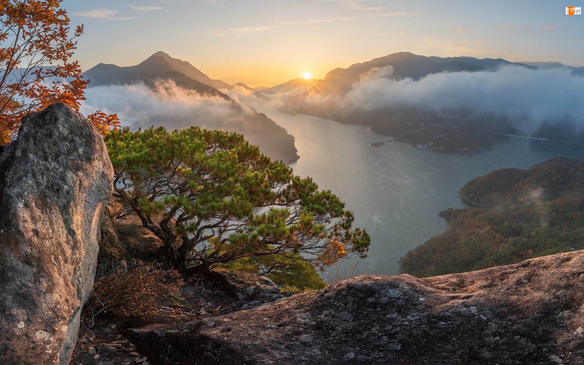 Góry, Zachód słońca, Skały, Mgła, Rzeka, Sosna