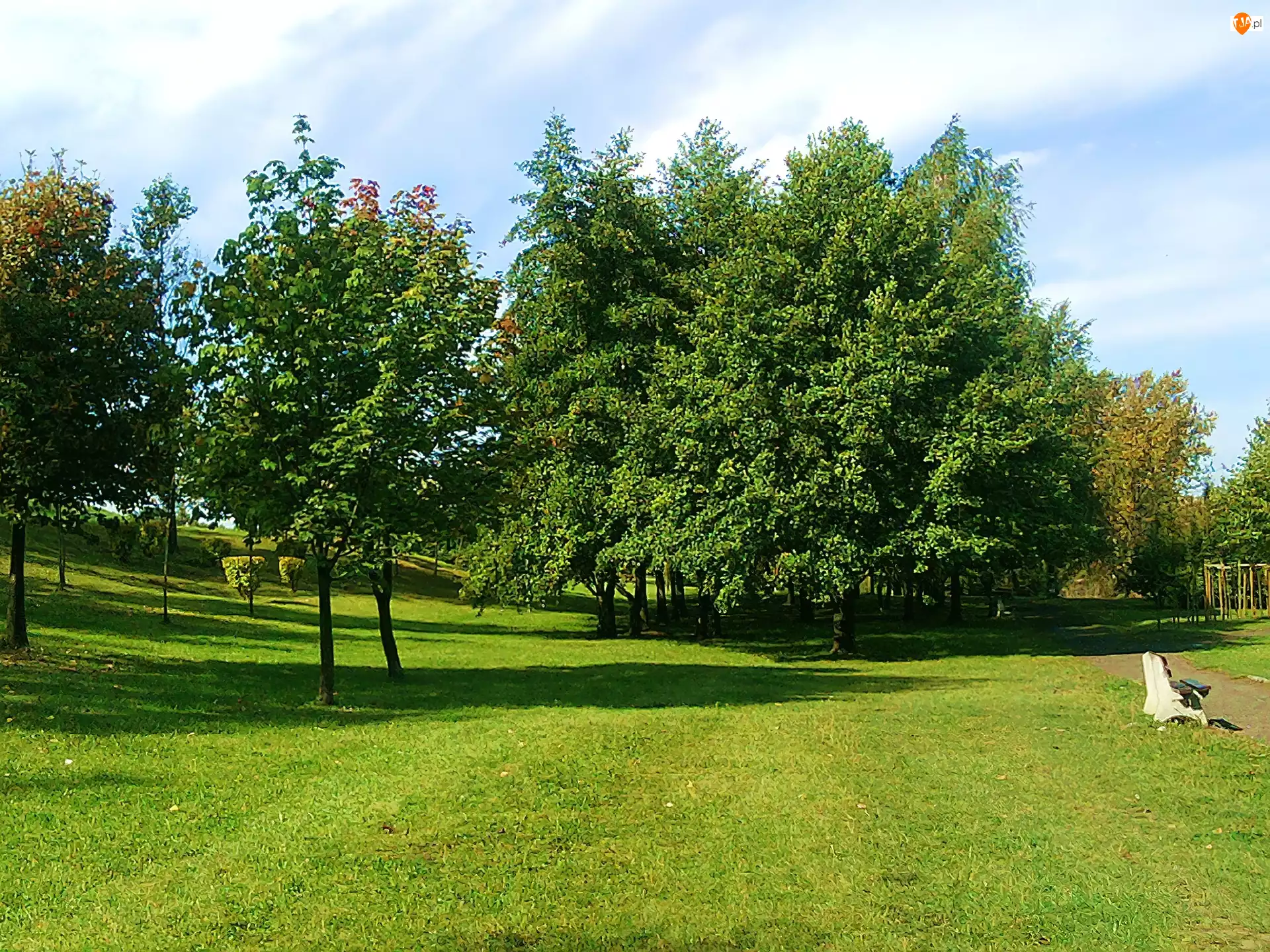 Sosnowiec, Park, Trawa, Drzewa, Ławka