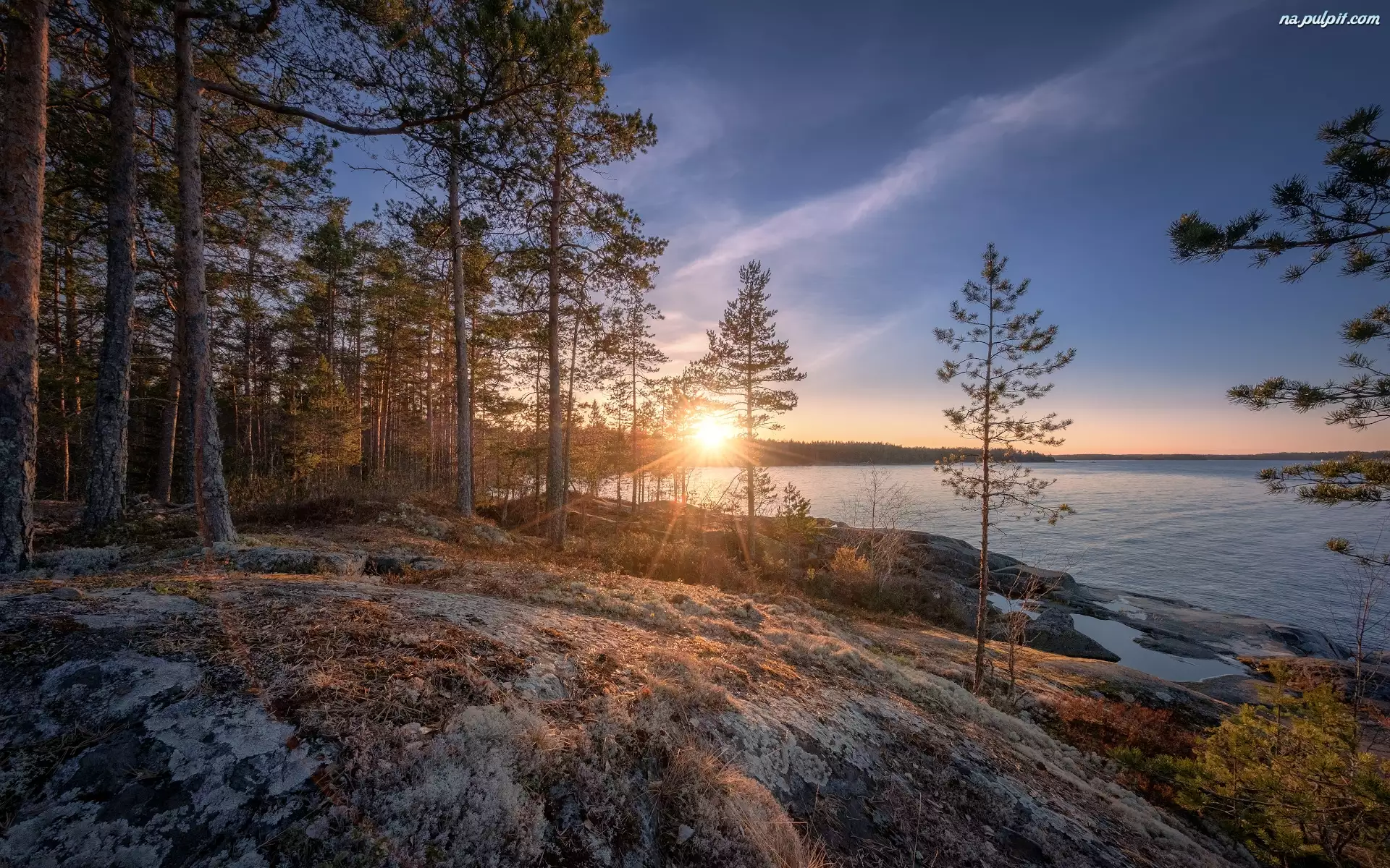 Karelia, Jezioro, Zachód słońca, Rosja, Skały, Drzewa, Ładoga