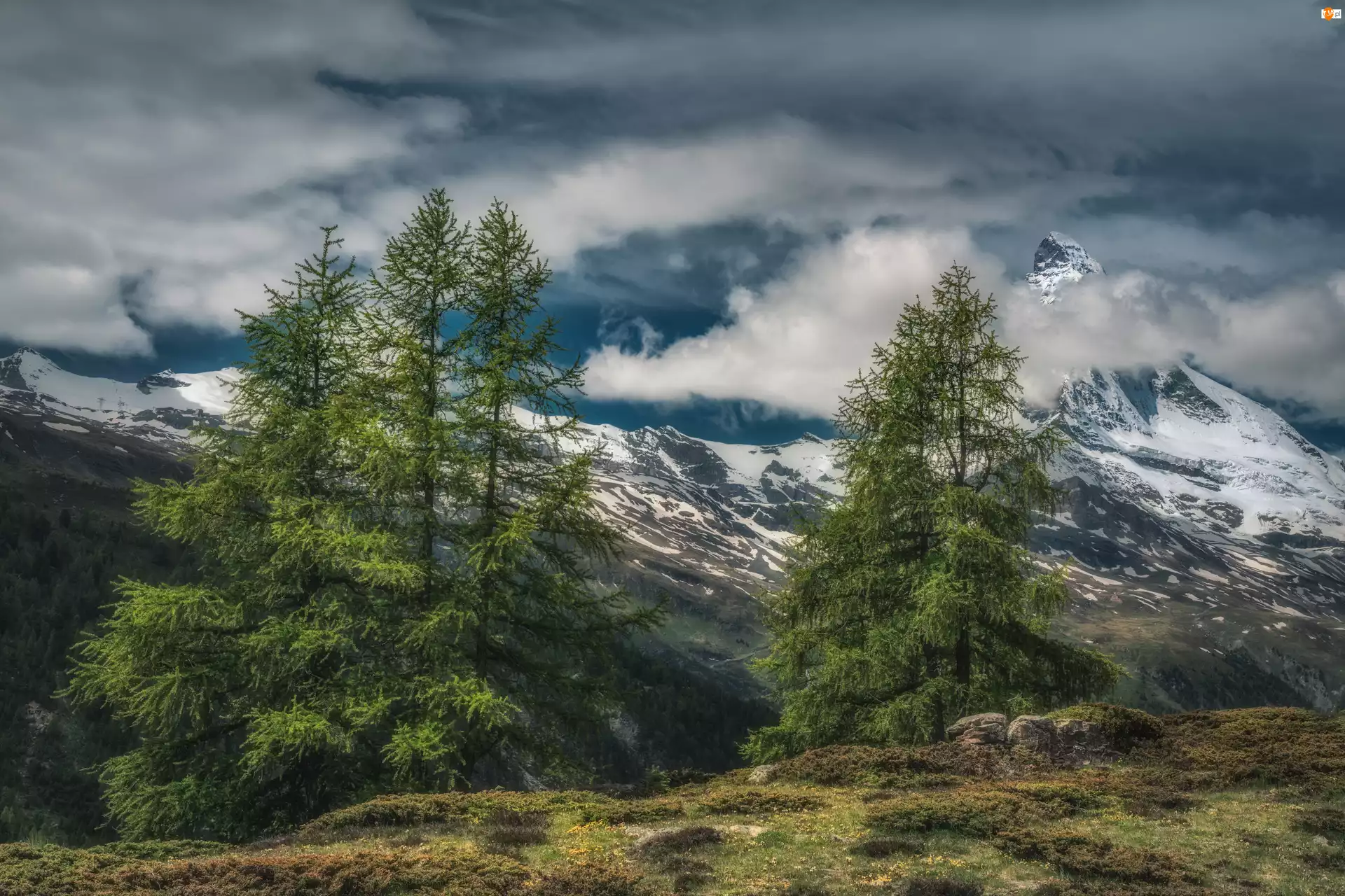 Drzewa, Góry, Śnieg, Niebo