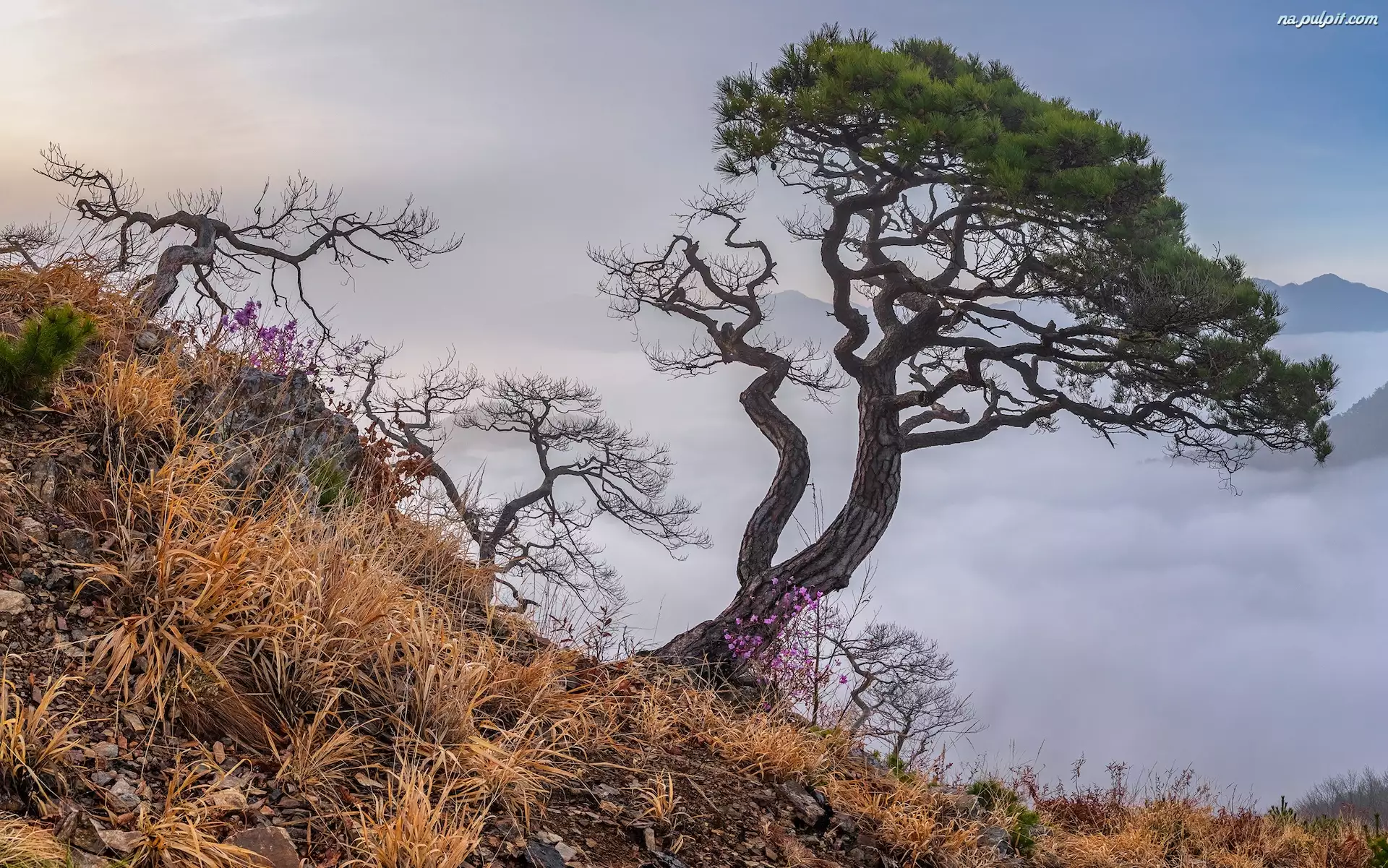 Wzgórze, Drzewo, Mgła, Trawa, Sosna, Jesień
