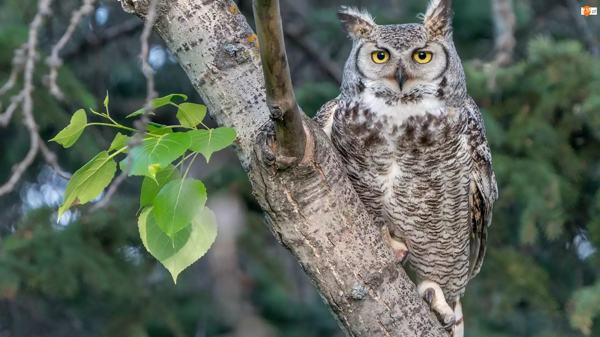 Drzewo, Liście, Puchacz, Sowa, Konar