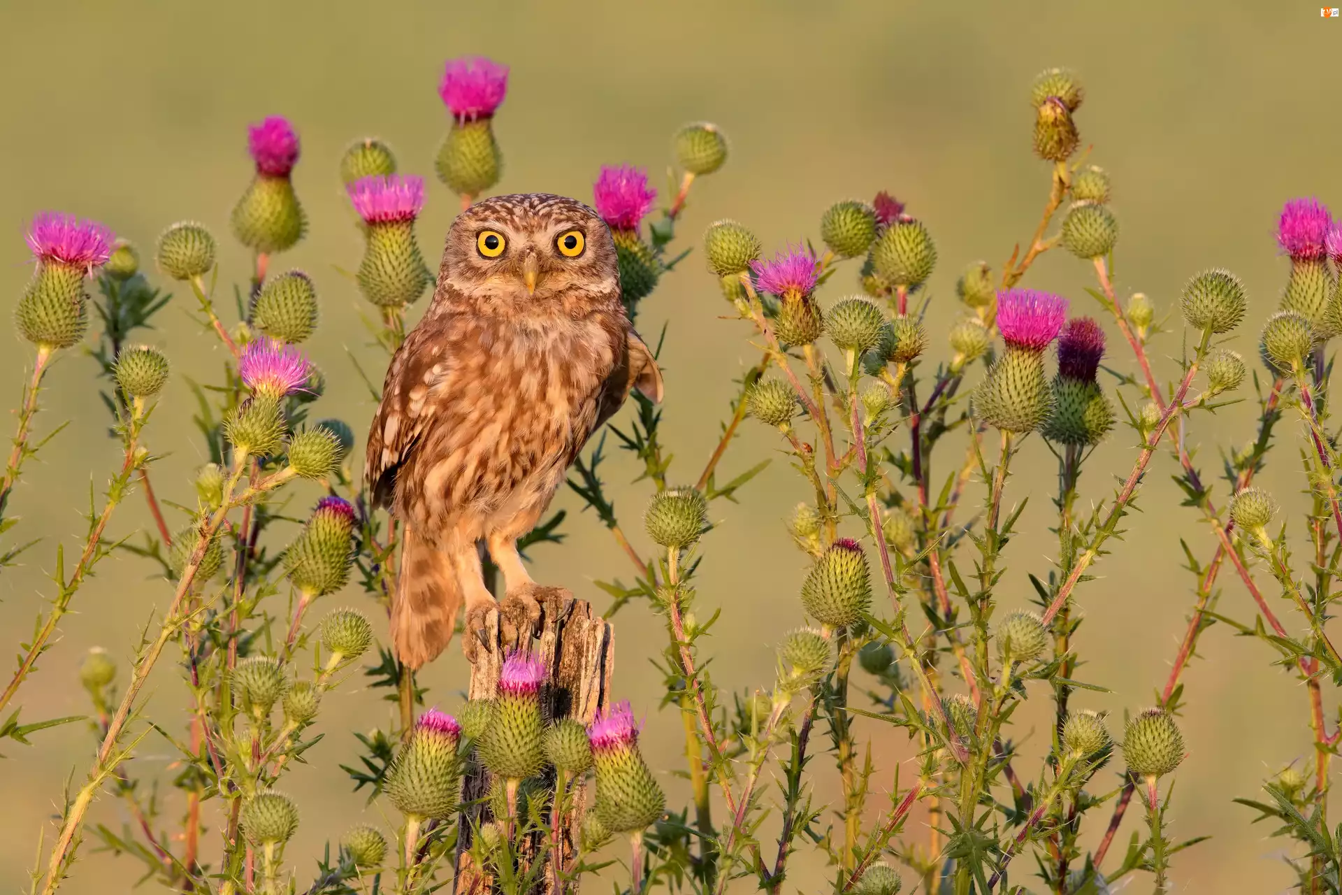 Sowa na pieńku pośród kwitnących ostów