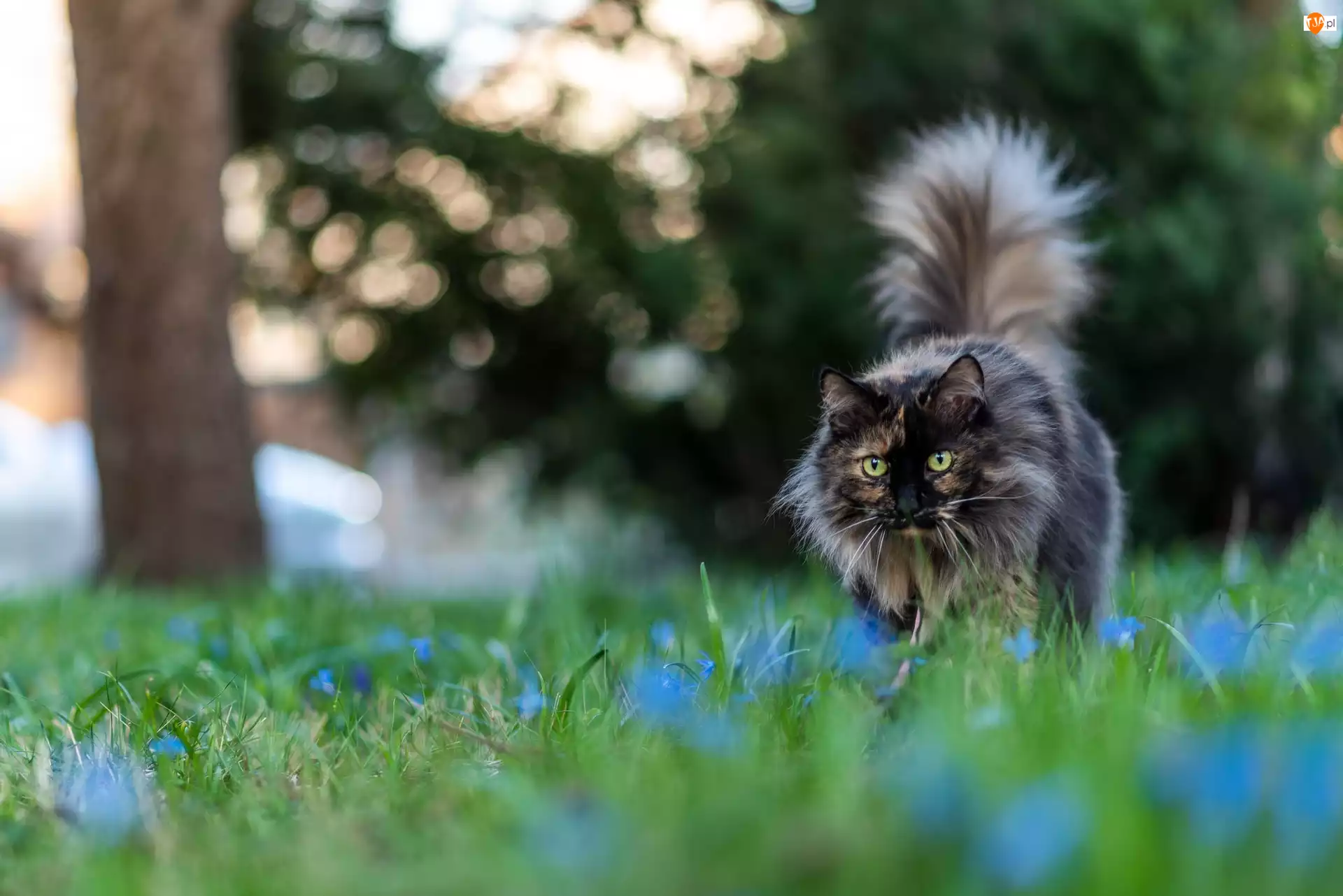 Kwiaty, Kot norweski leśny, Drzewa, Trawa